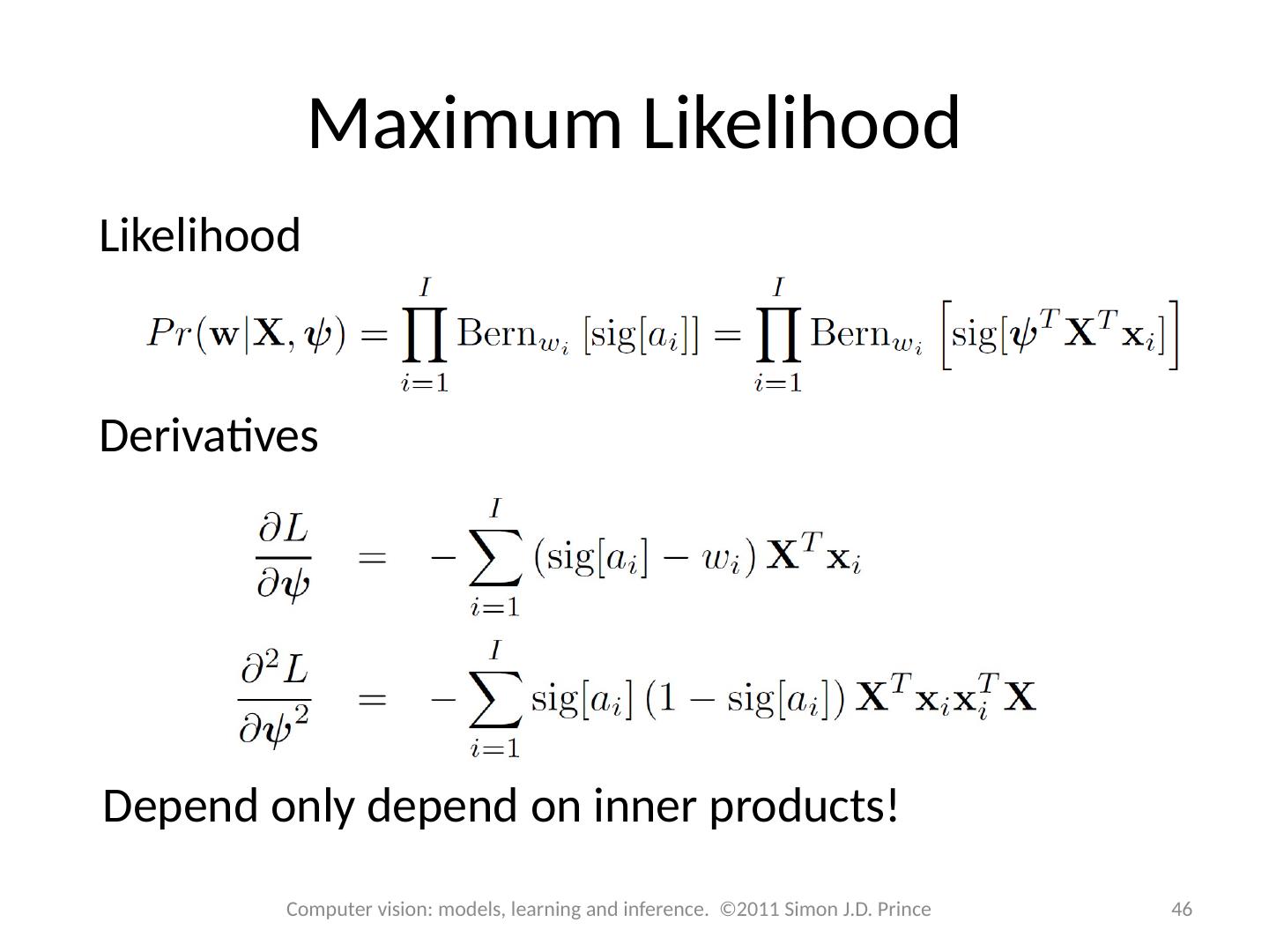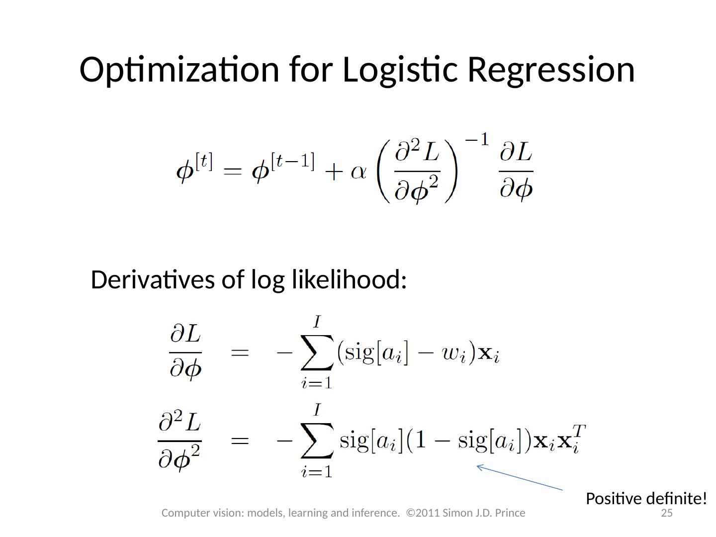 25 .Optimization for Logistic Regression Derivatives of log likelihood: Positive definite! 25 Computer vision: models, learning and inference. ©2011 Simon J.D. Prince