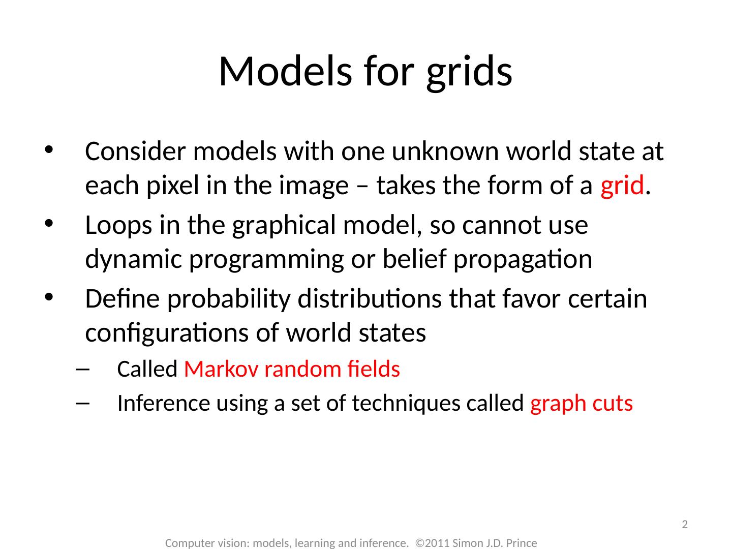 2 .Models for grids 2 Computer vision: models, learning and inference. ©2011 Simon J.D. Prince Consider models with one unknown world state at each pixel in the image – takes the form of a grid . Loops in the graphical model, so cannot use dynamic programming or belief propagation Define probability distributions that favor certain configurations of world states Called Markov random fields Inference using a set of techniques called graph cuts