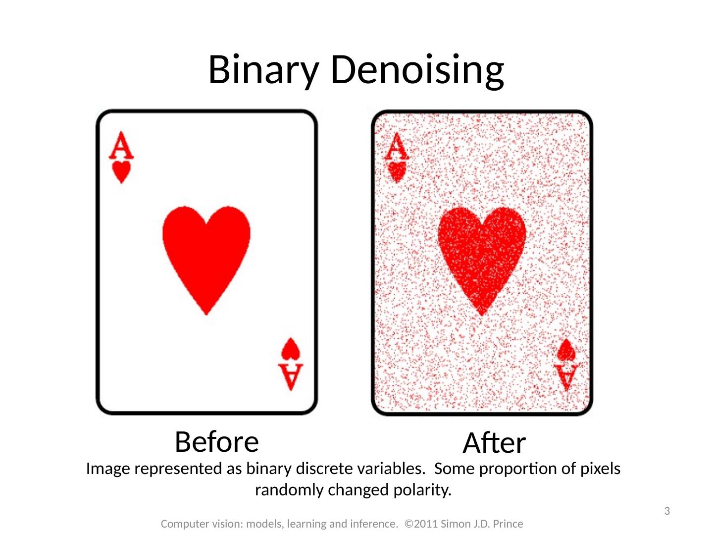 3 .3 Computer vision: models, learning and inference. ©2011 Simon J.D. Prince Binary Denoising Before After Image represented as binary discrete variables. Some proportion of pixels randomly changed polarity.