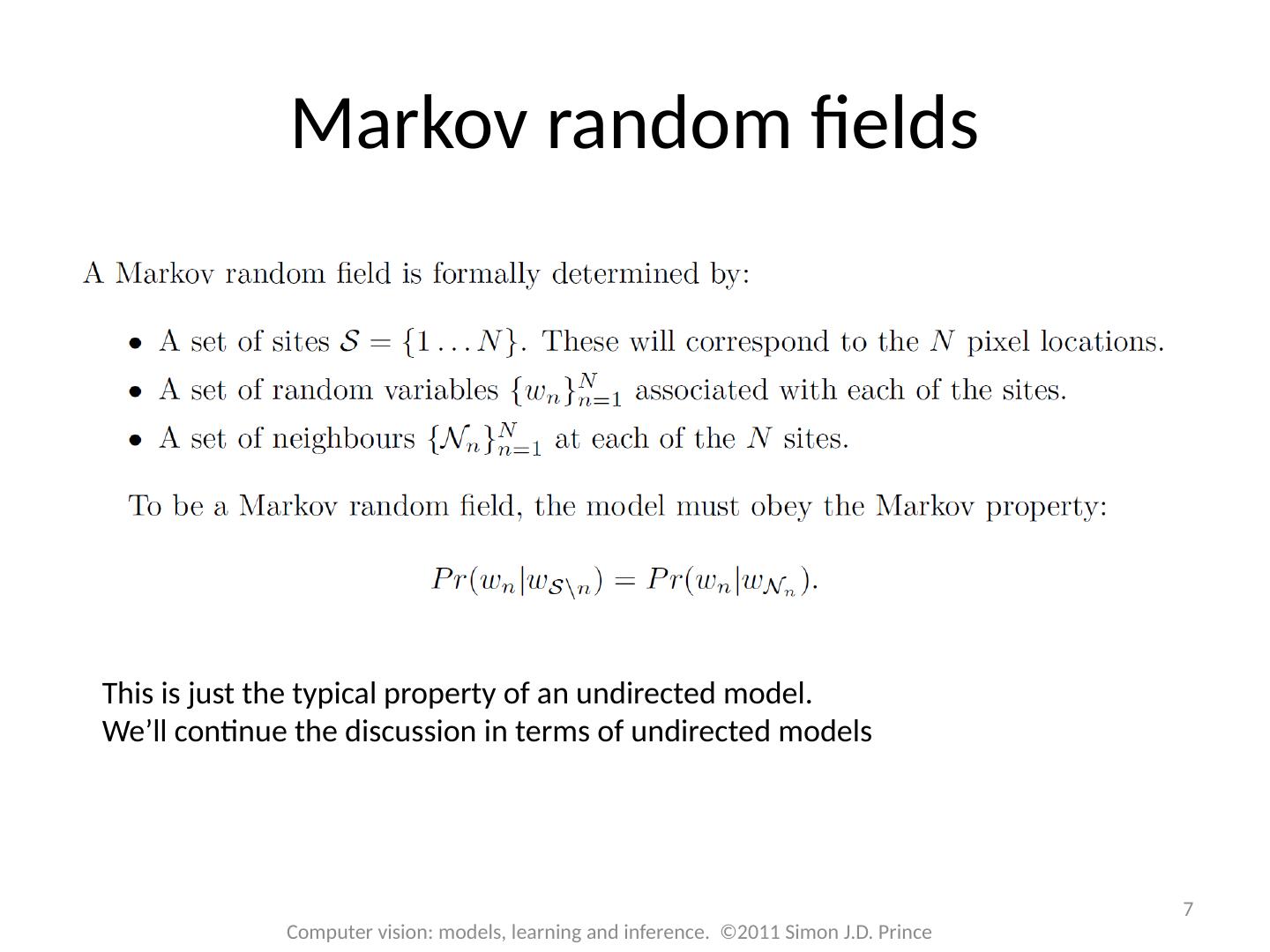 7 .7 Computer vision: models, learning and inference. ©2011 Simon J.D. Prince Markov random fields This is just the typical property of an undirected model. We’ll continue the discussion in terms of undirected models