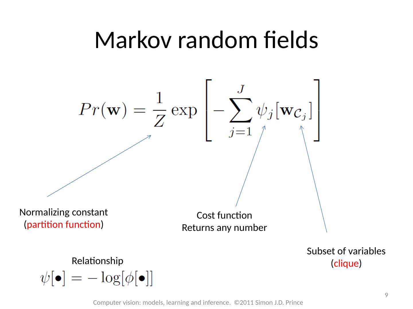 9 .9 Computer vision: models, learning and inference. ©2011 Simon J.D. Prince Markov random fields Normalizing constant ( partition function ) Cost function Returns any number Subset of variables ( clique ) Relationship