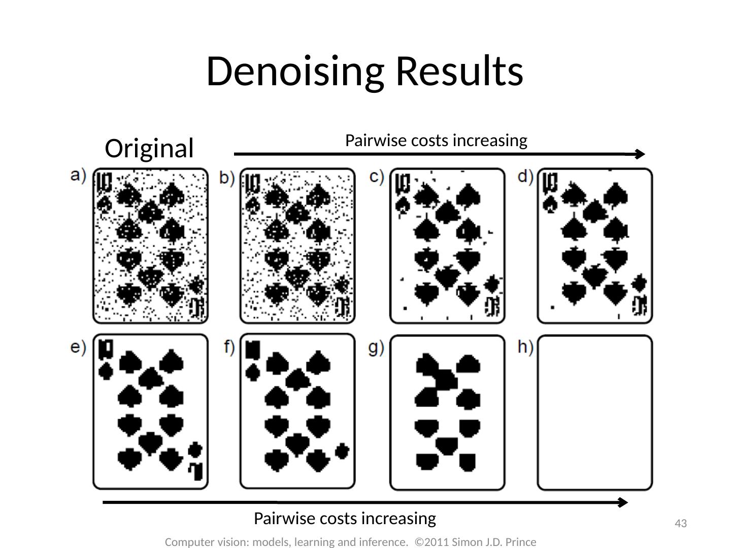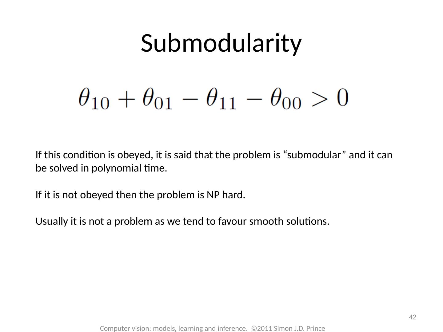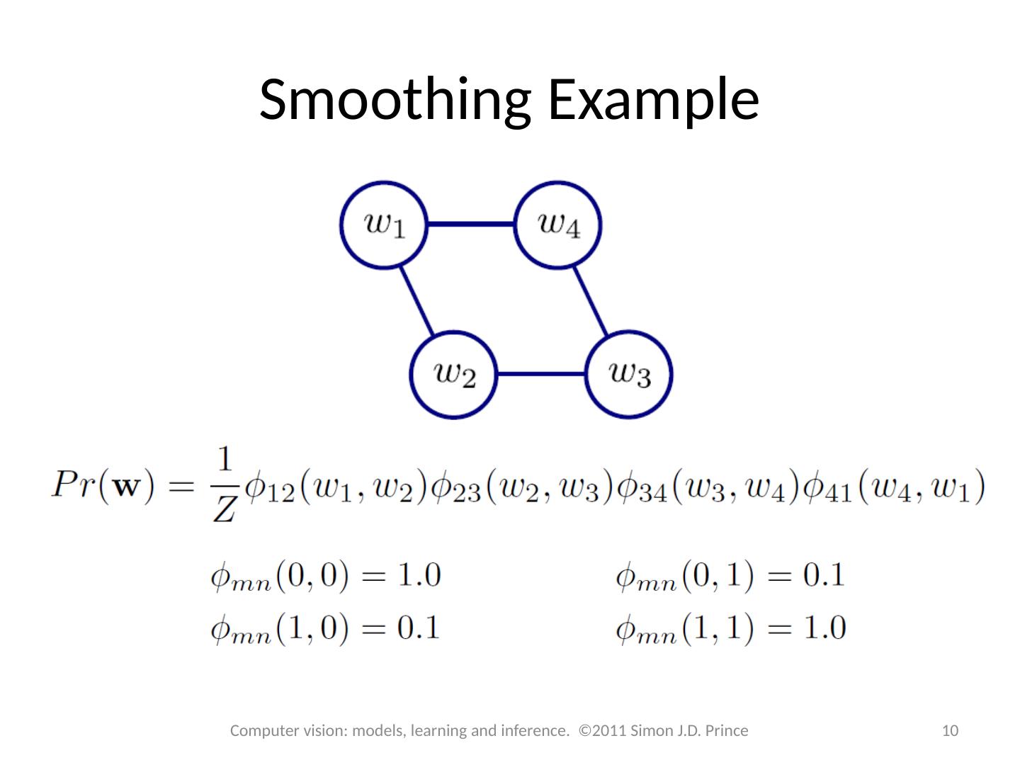 11 .11 Computer vision: models, learning and inference. ©2011 Simon J.D. Prince Smoothing Example Smooth solutions (e.g. 0000,1111) have high probability Z was computed by summing the 16 un-normalized probabilities