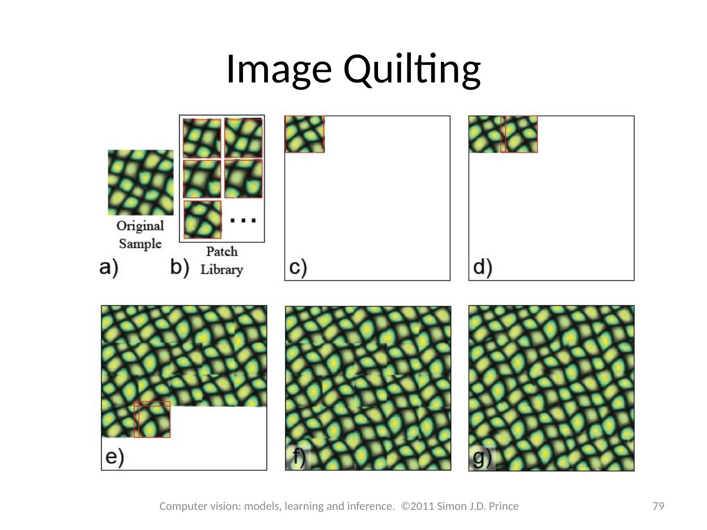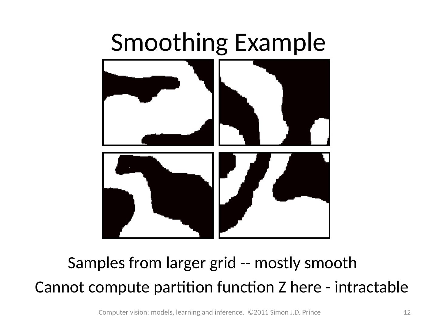 12 .12 Computer vision: models, learning and inference. ©2011 Simon J.D. Prince Smoothing Example Samples from larger grid -- mostly smooth Cannot compute partition function Z here - intractable