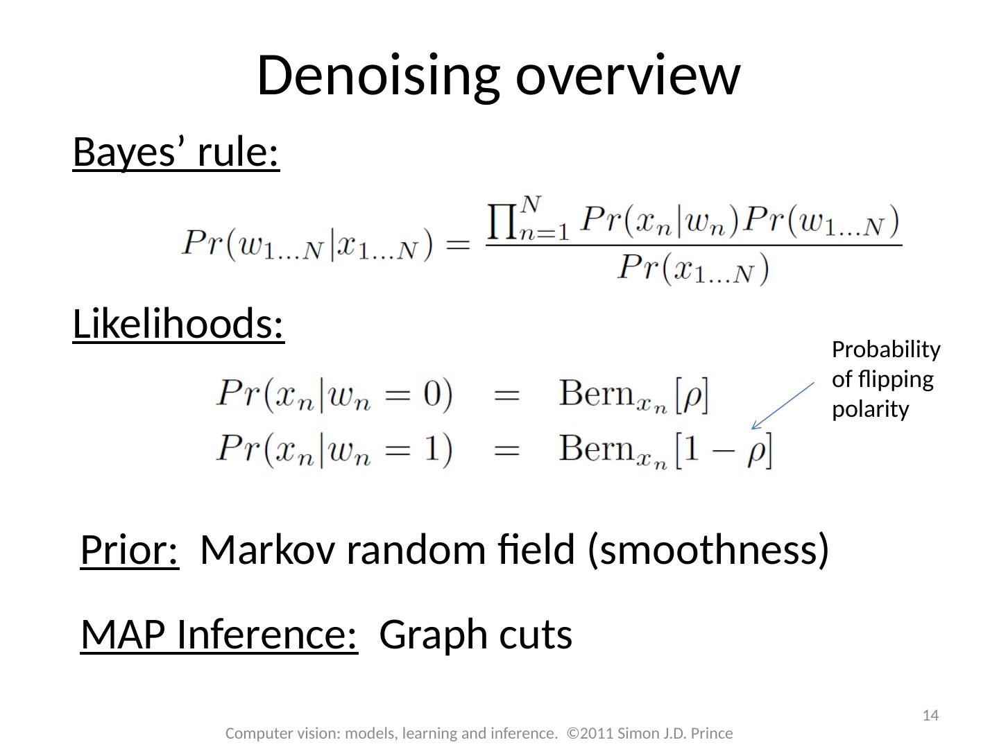 14 .14 Computer vision: models, learning and inference. ©2011 Simon J.D. Prince Denoising overview Bayes ’ rule: Likelihoods: Prior: Markov random field (smoothness) MAP Inference: Graph cuts Probability of flipping polarity