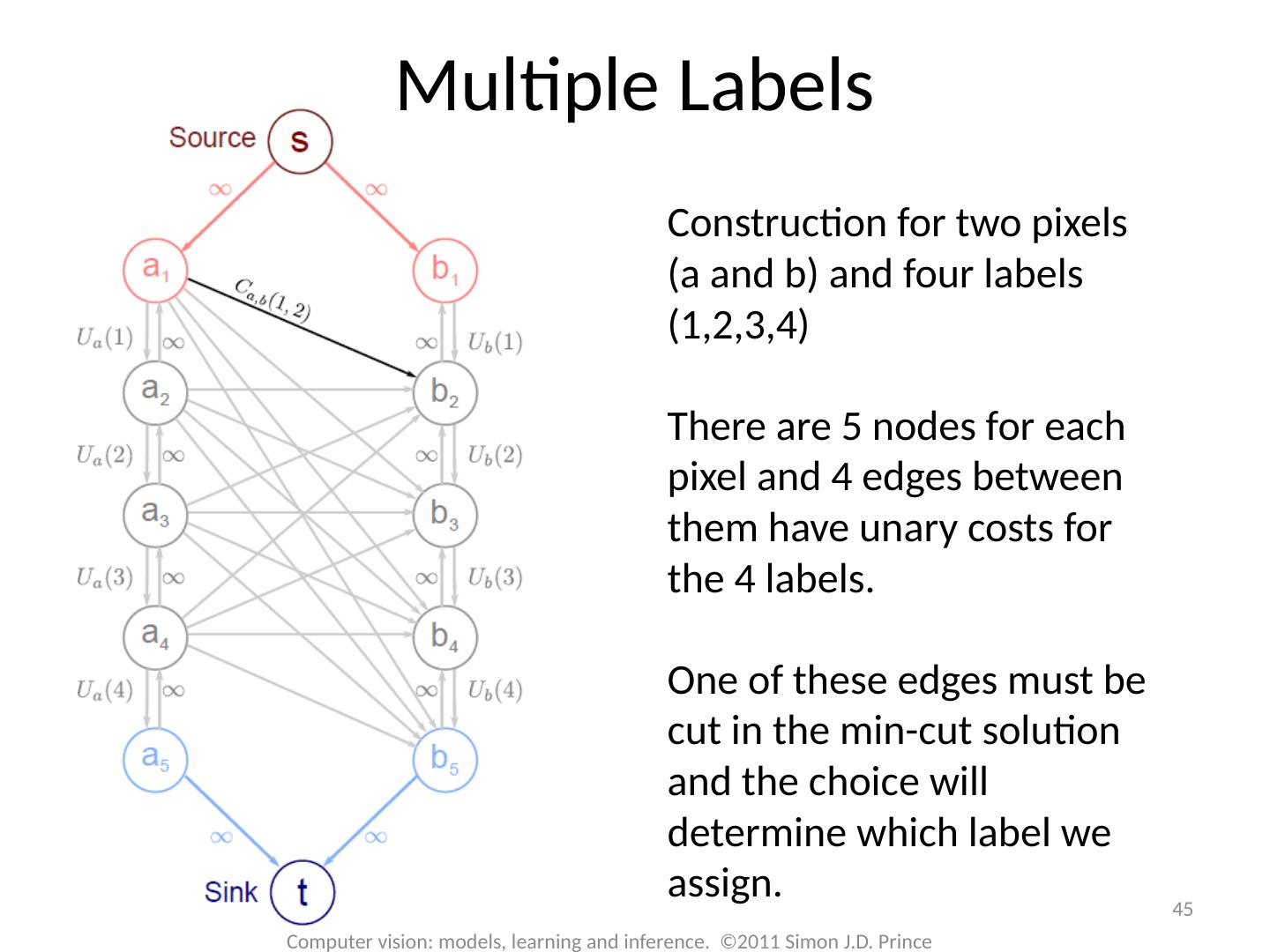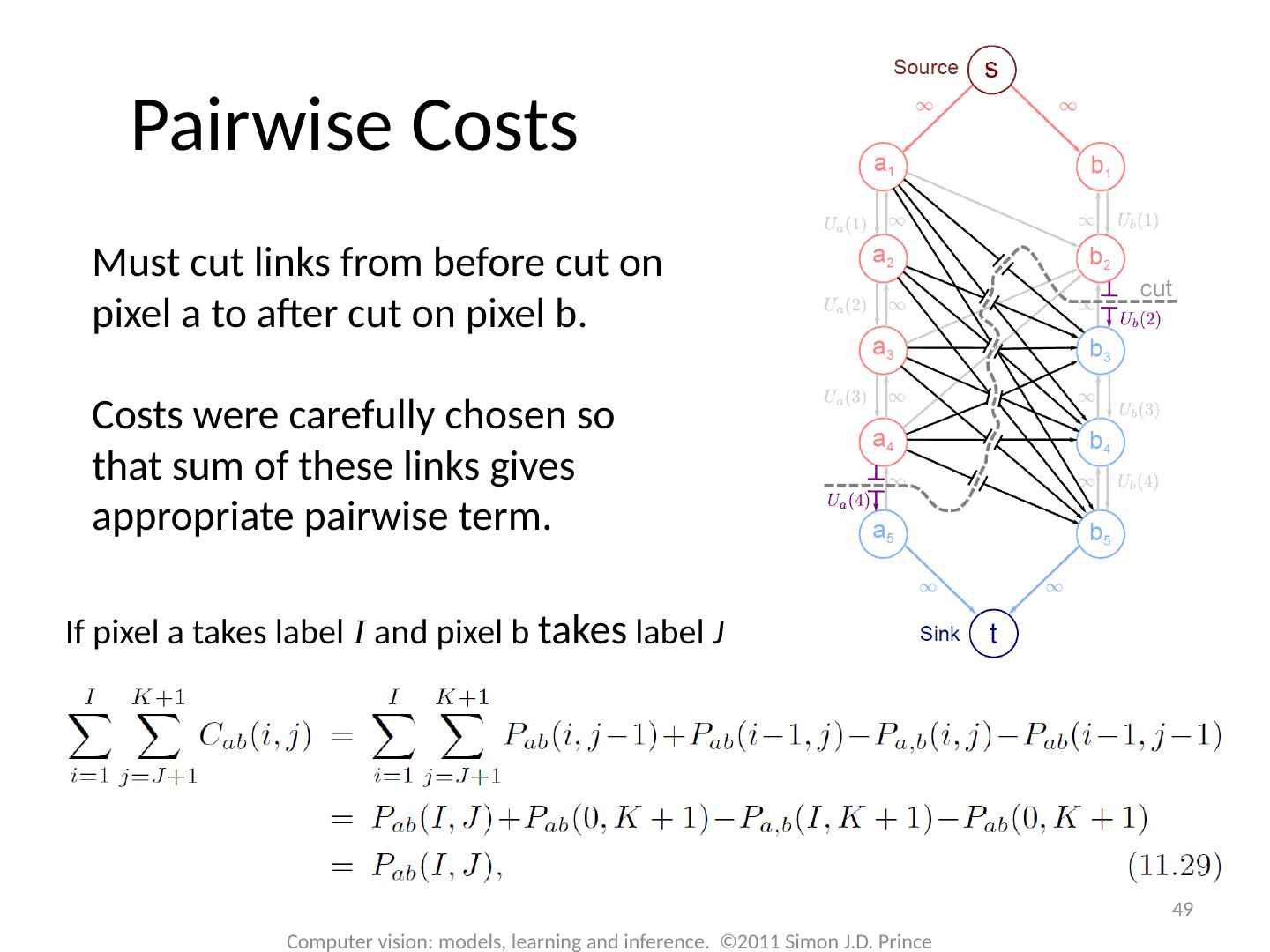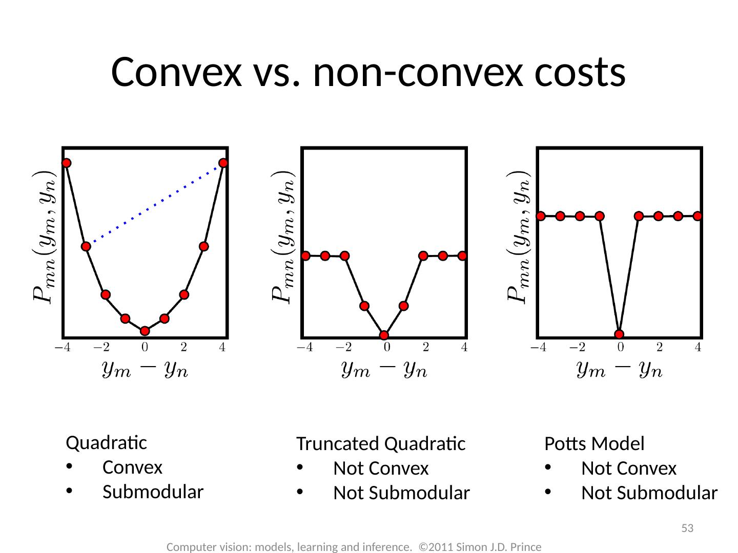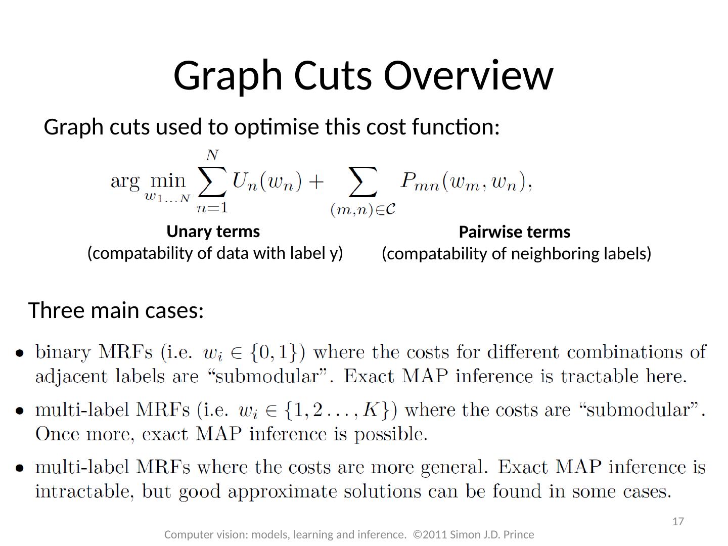 17 .17 Computer vision: models, learning and inference. ©2011 Simon J.D. Prince Graph Cuts Overview Unary terms ( compatability of data with label y) Pairwise terms ( compatability of neighboring labels) Graph cuts used to optimise this cost function: Three main cases: