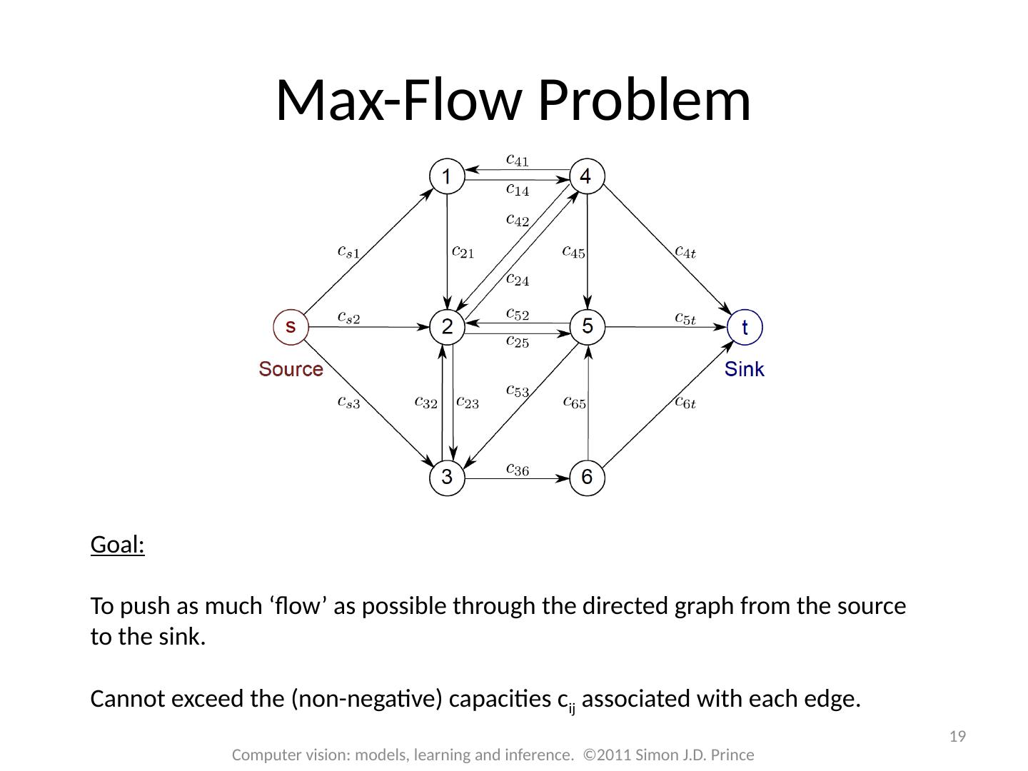 19 .19 Computer vision: models, learning and inference. ©2011 Simon J.D. Prince Max-Flow Problem Goal: To push as much ‘flow’ as possible through the directed graph from the source to the sink. Cannot exceed the (non-negative) capacities c ij associated with each edge.