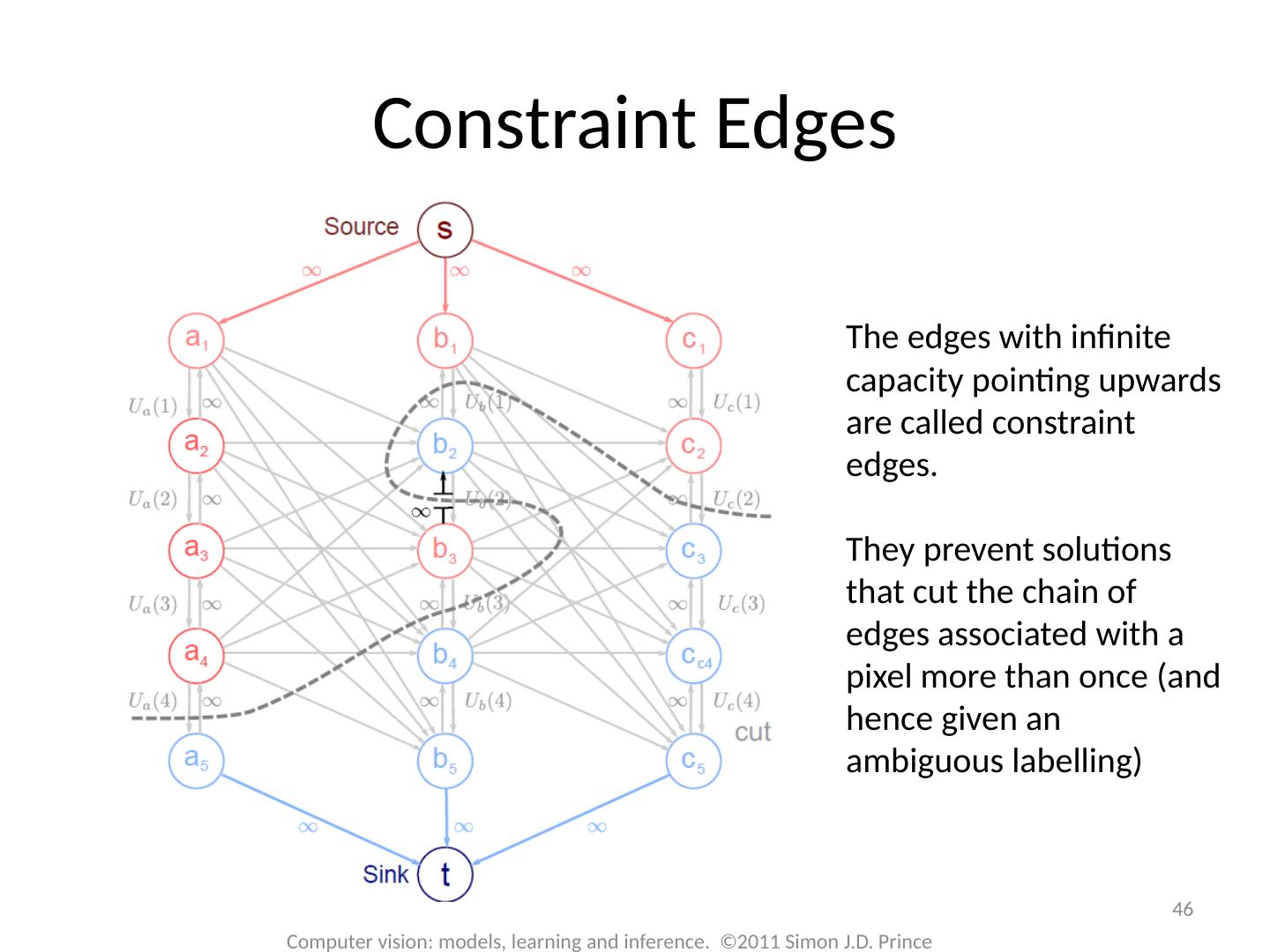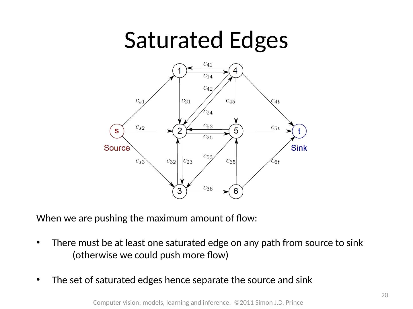 20 .20 Computer vision: models, learning and inference. ©2011 Simon J.D. Prince Saturated Edges When we are pushing the maximum amount of flow: There must be at least one saturated edge on any path from source to sink (otherwise we could push more flow) The set of saturated edges hence separate the source and sink