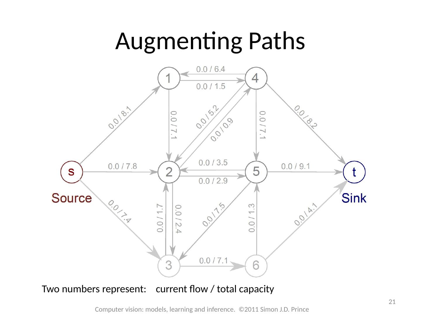21 .21 Computer vision: models, learning and inference. ©2011 Simon J.D. Prince Augmenting Paths Two numbers represent: current flow / total capacity