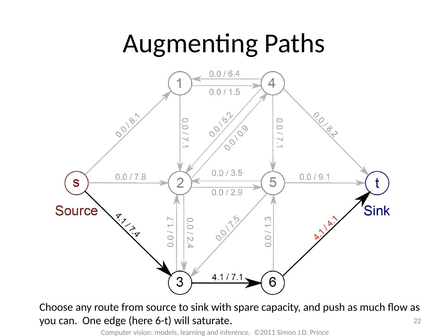 22 .Choose any route from source to sink with spare capacity, and push as much flow as you can. One edge (here 6-t) will saturate. 22 Computer vision: models, learning and inference. ©2011 Simon J.D. Prince Augmenting Paths