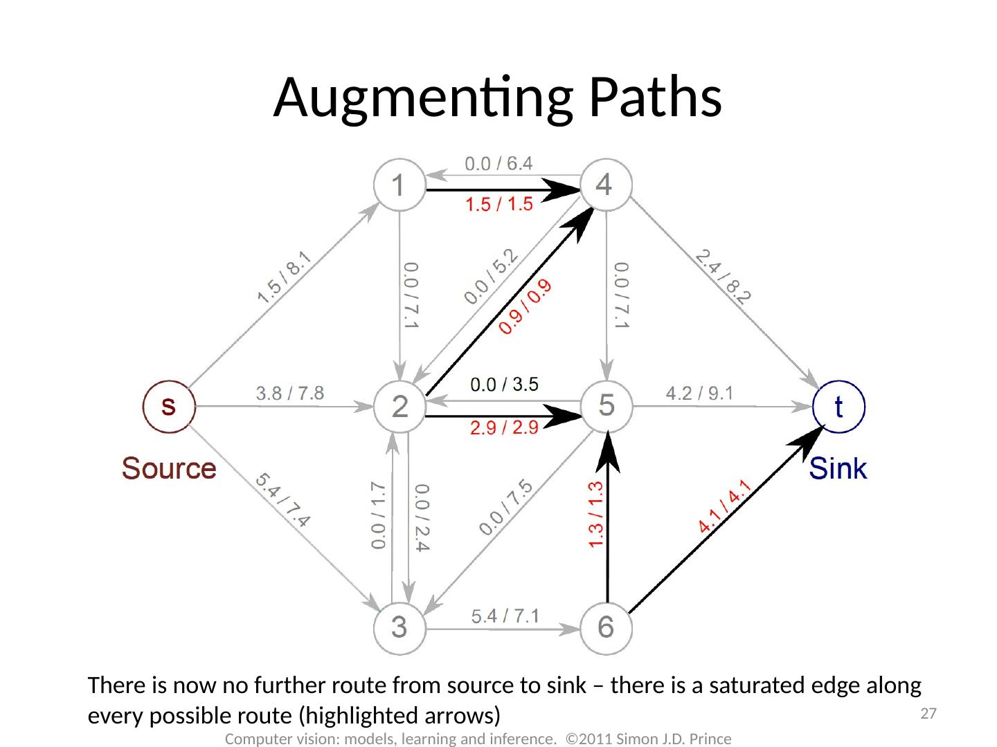 27 .There is now no further route from source to sink – there is a saturated edge along every possible route (highlighted arrows) 27 Computer vision: models, learning and inference. ©2011 Simon J.D. Prince Augmenting Paths
