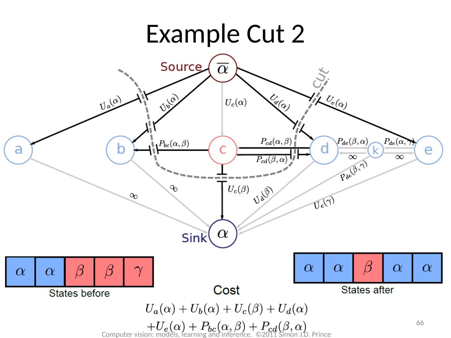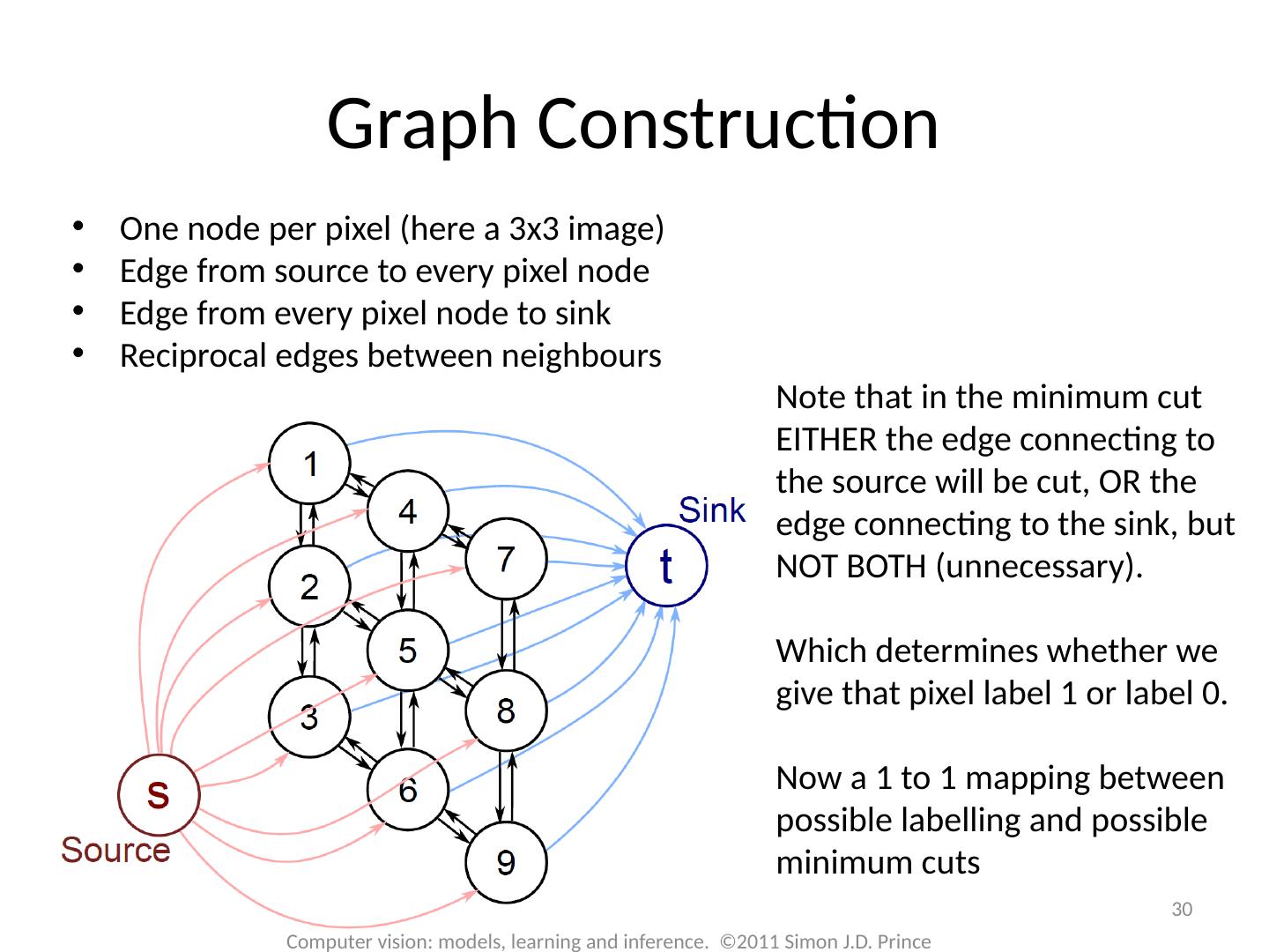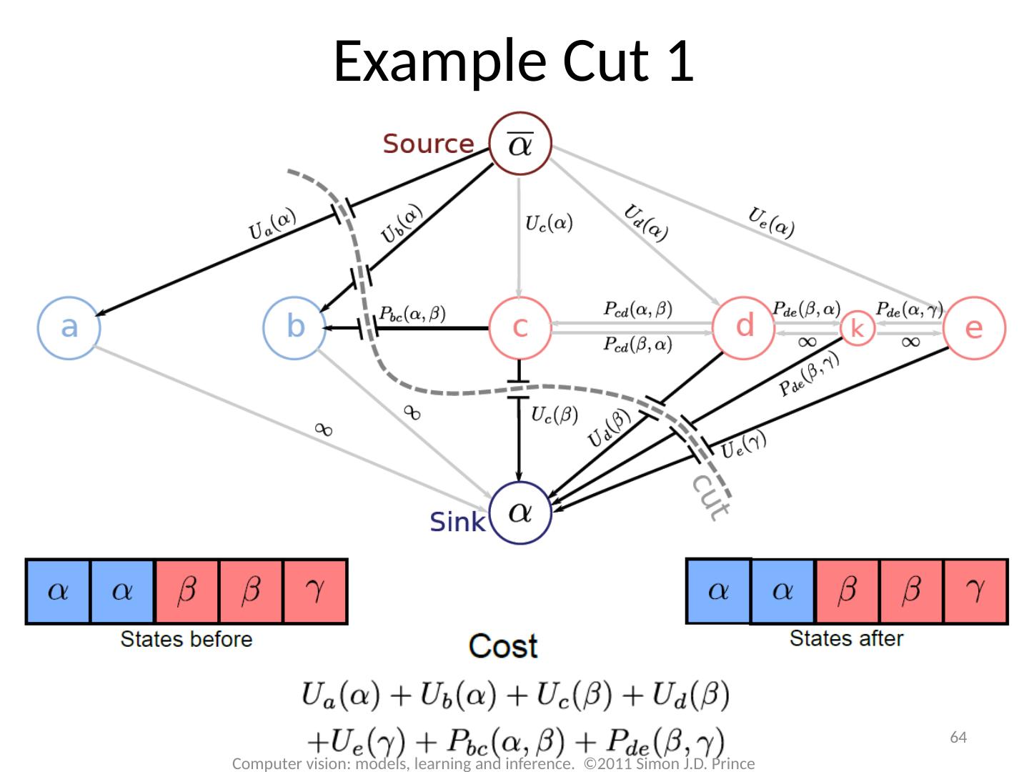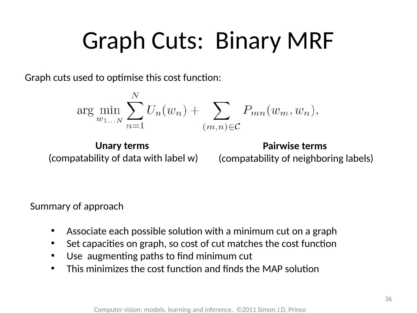 18 .18 Computer vision: models, learning and inference. ©2011 Simon J.D. Prince Graph Cuts Overview Unary terms ( compatability of data with label y) Pairwise terms ( compatability of neighboring labels) Graph cuts used to optimise this cost function: Approach: Convert minimization into the form of a standard CS problem, MAXIMUM FLOW or MINIMUM CUT ON A GRAPH Polynomial-time methods for solving this problem are known