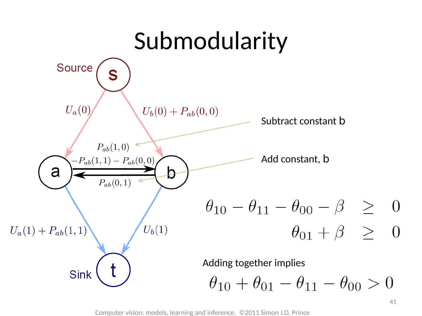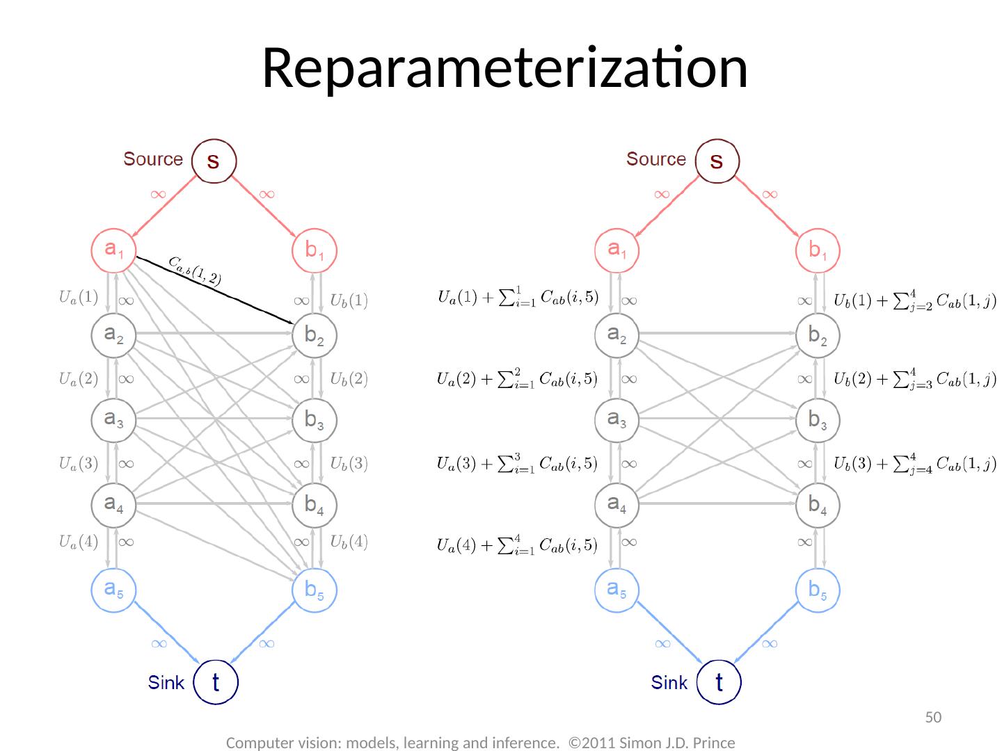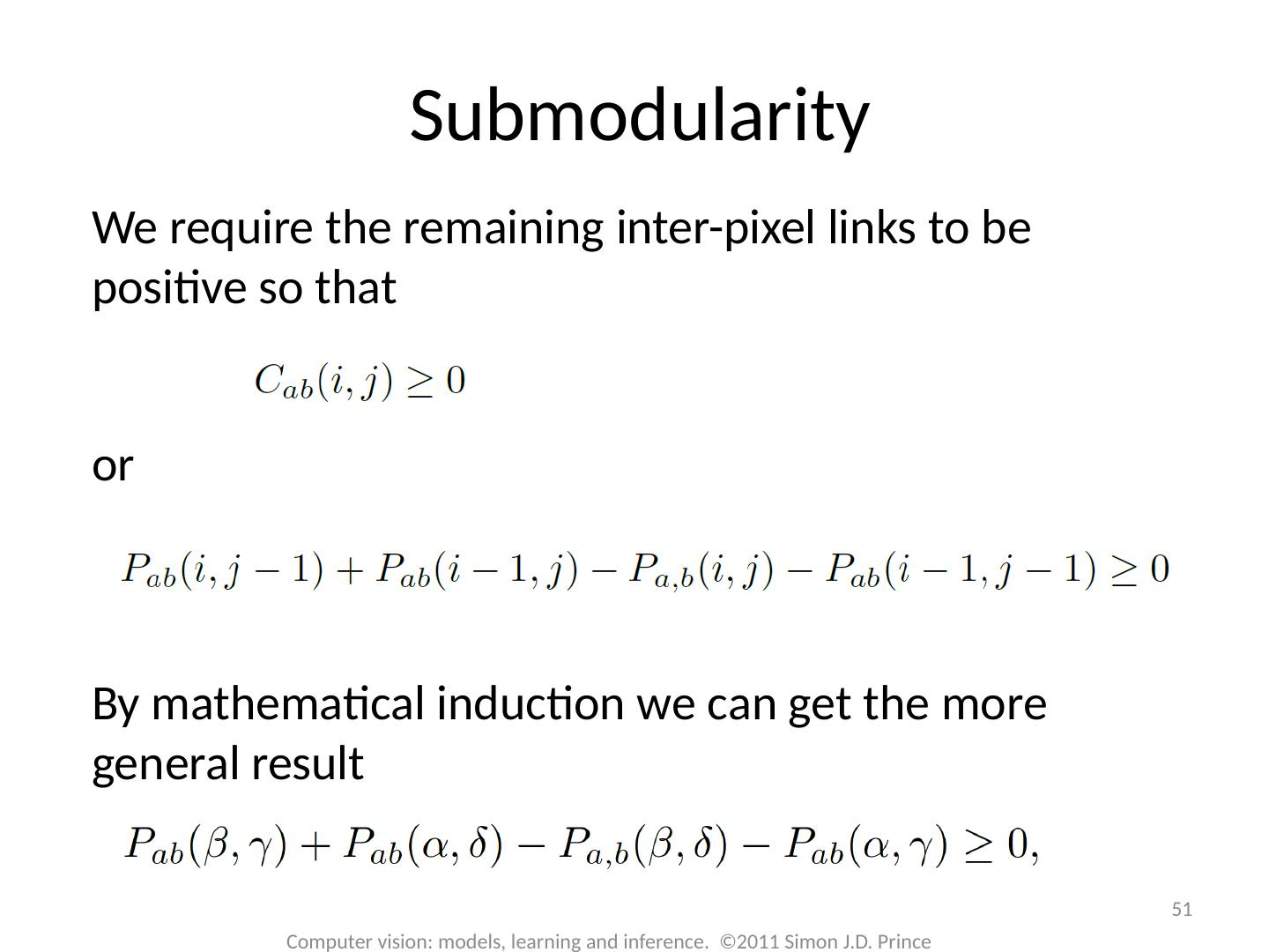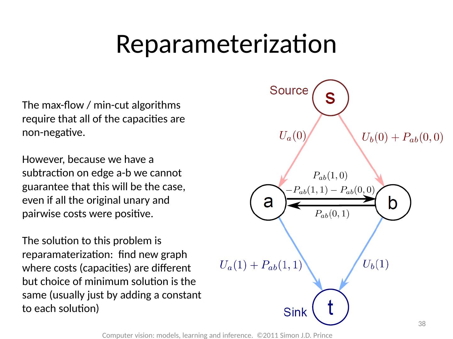 23 .23 Computer vision: models, learning and inference. ©2011 Simon J.D. Prince Augmenting Paths Choose another route, respecting remaining capacity. This time edge 6-5 saturates.