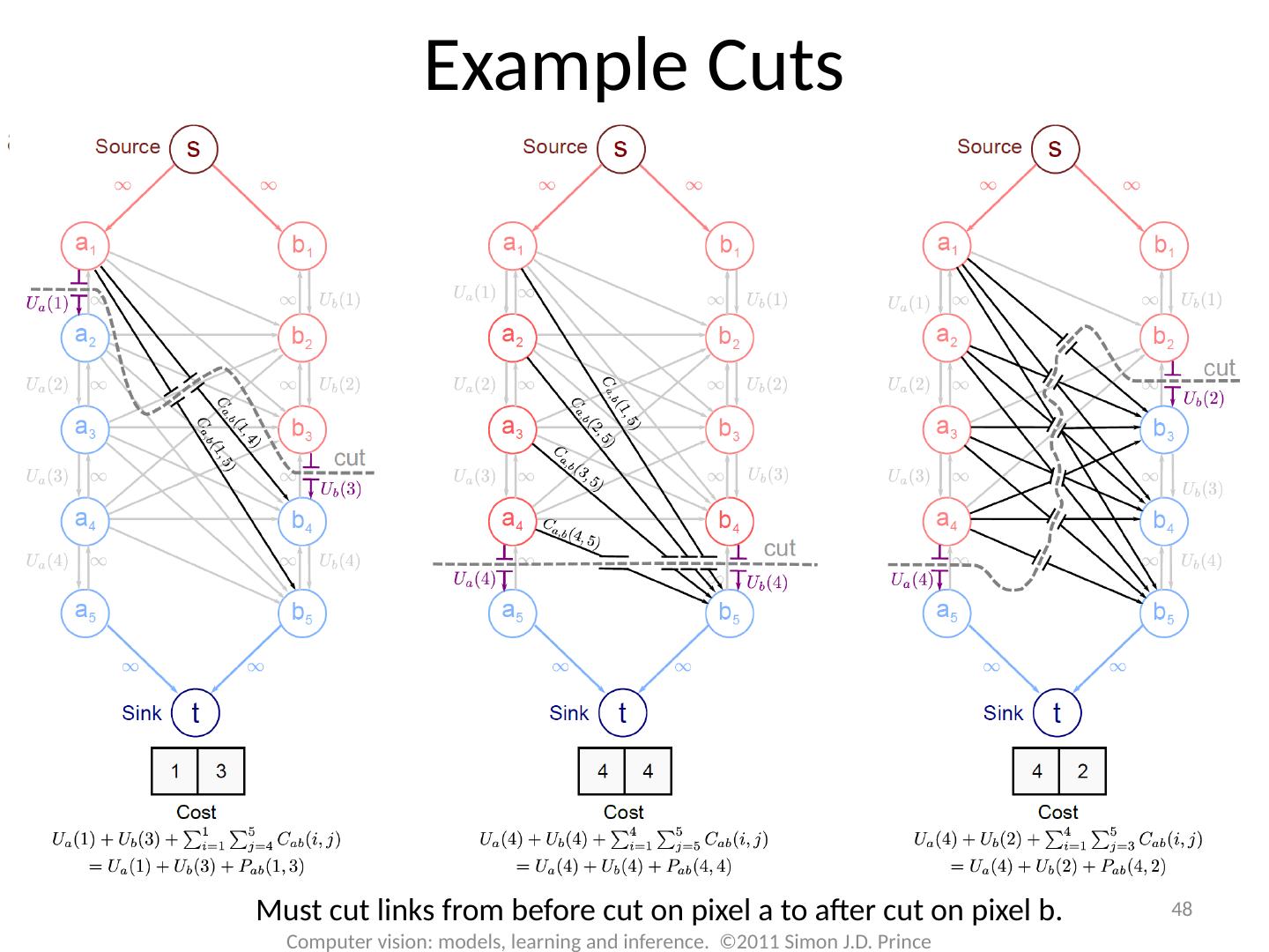 28 .28 Computer vision: models, learning and inference. ©2011 Simon J.D. Prince Augmenting Paths The saturated edges separate the source from the sink and form the min-cut solution. Nodes either connect to the source or connect to the sink.