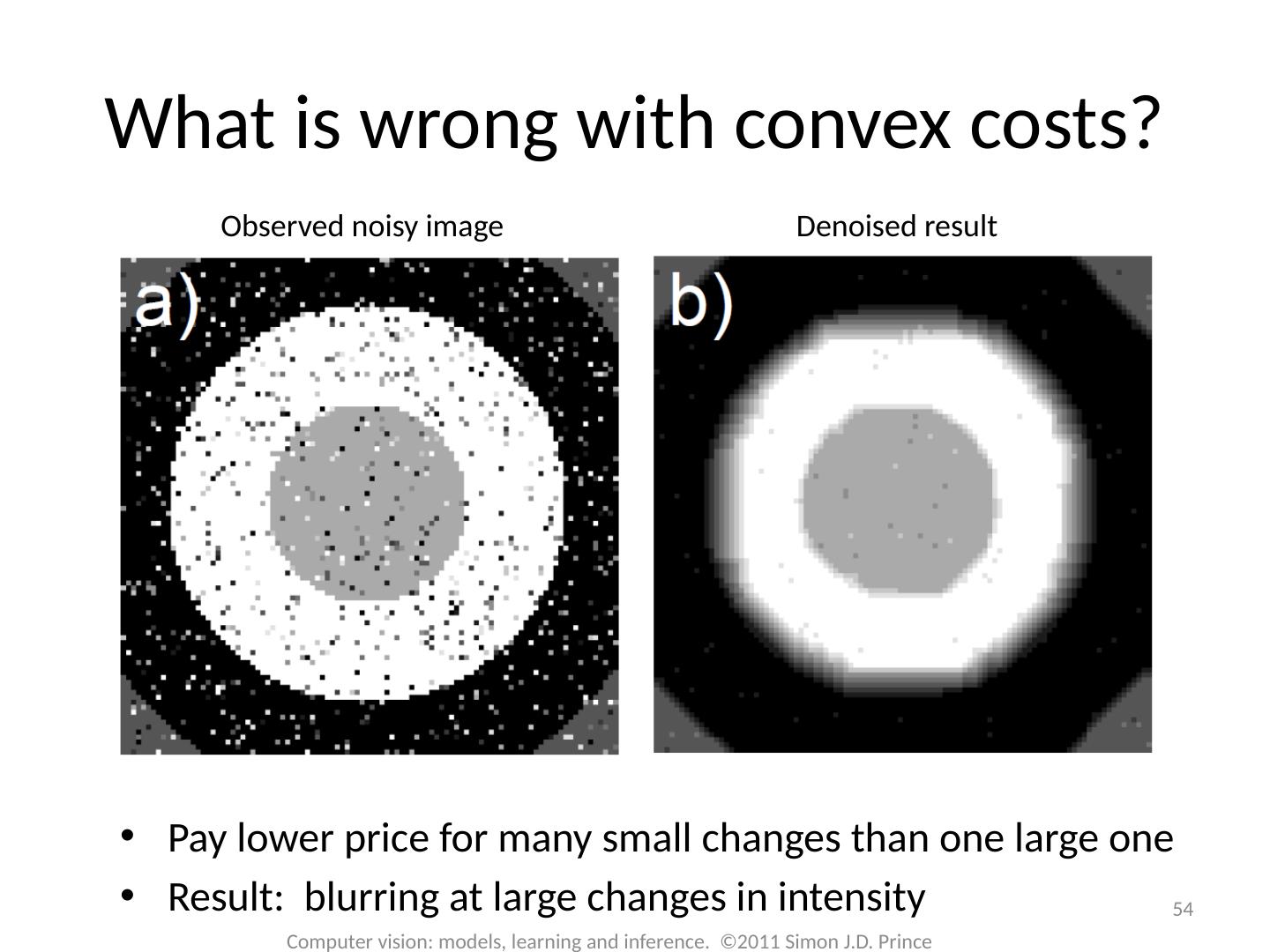 15 .15 Computer vision: models, learning and inference. ©2011 Simon J.D. Prince Denoising with MRFs Observed image, x Original image, w MRF Prior ( pairwise cliques) Inference : Likelihoods