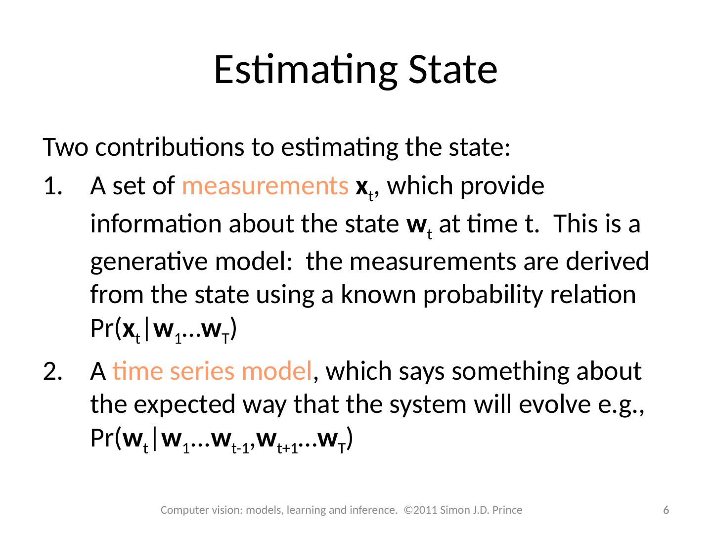 6 .6 Estimating State Two contributions to estimating the state: A set of measurements x t , which provide information about the state w t at time t. This is a generative model: the measurements are derived from the state using a known probability relation Pr( x t | w 1 … w T ) A time series model , which says something about the expected way that the system will evolve e.g., Pr( w t | w 1 ... w t-1 , w t+1 … w T ) 6 Computer vision: models, learning and inference. ©2011 Simon J.D. Prince