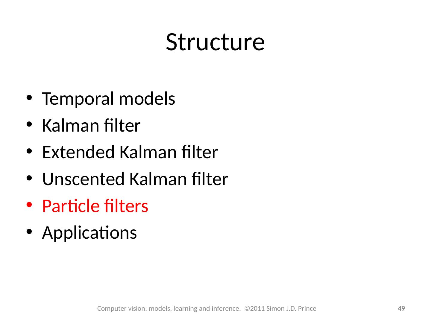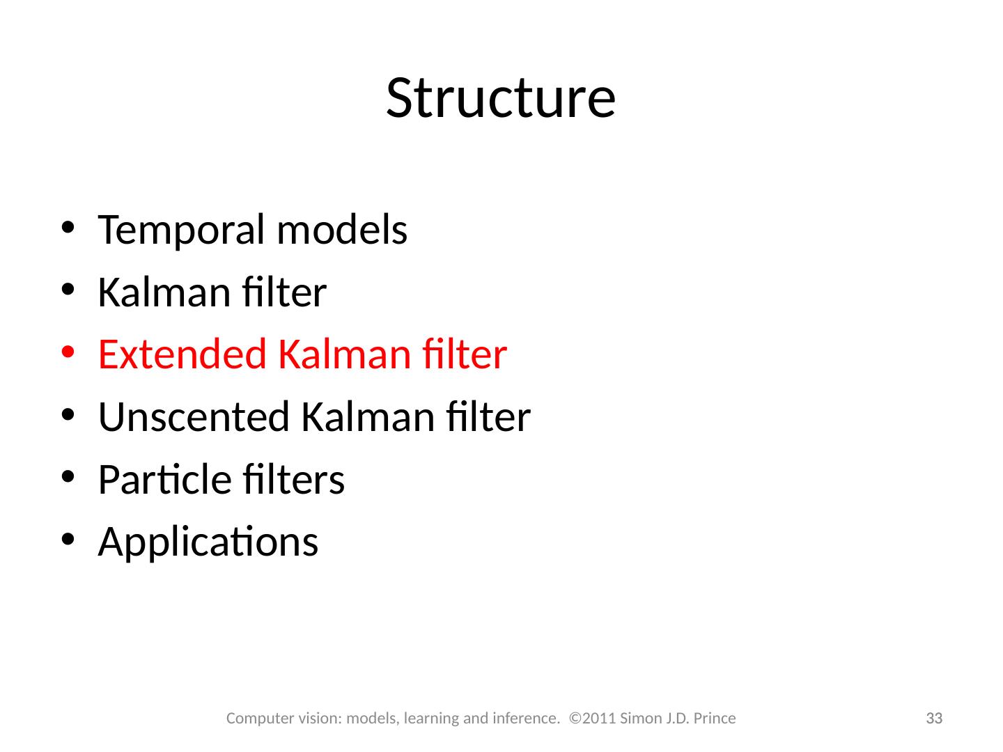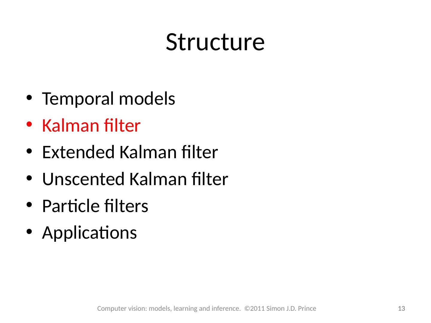 4 .Structure 4 4 Computer vision: models, learning and inference. ©2011 Simon J.D. Prince Temporal models Kalman filter Extended Kalman filter Unscented Kalman filter Particle filters Applications