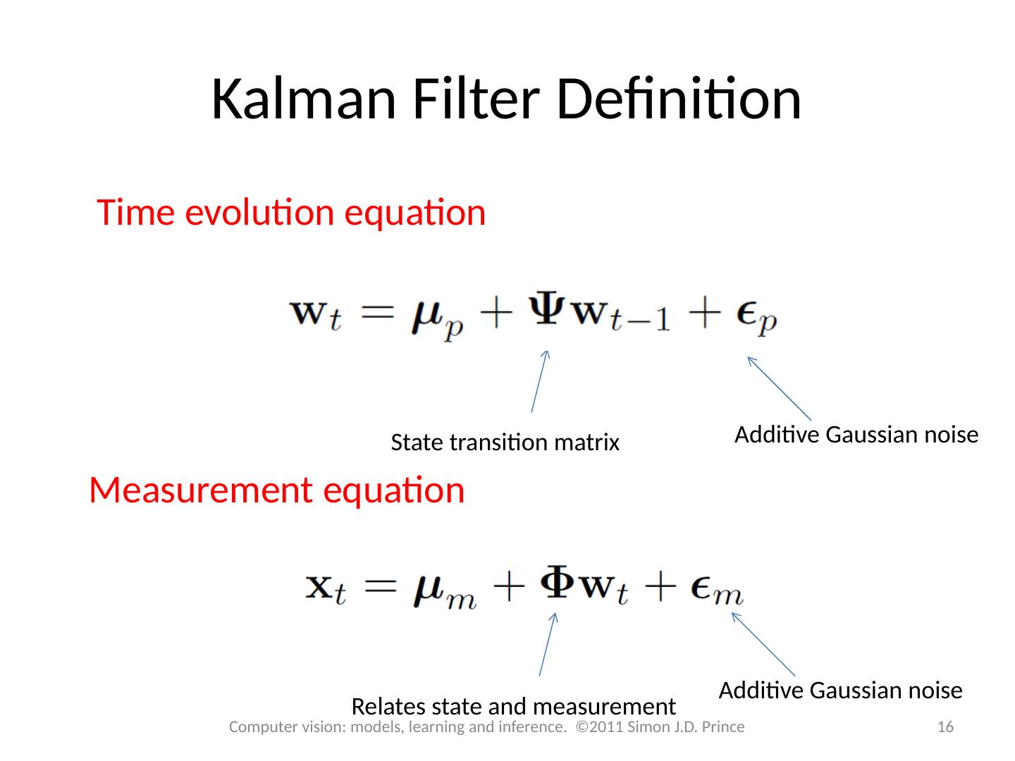 16 .Kalman Filter Definition Time evolution equation Measurement equation State transition matrix Additive Gaussian noise Additive Gaussian noise Relates state and measurement 16 Computer vision: models, learning and inference. ©2011 Simon J.D. Prince