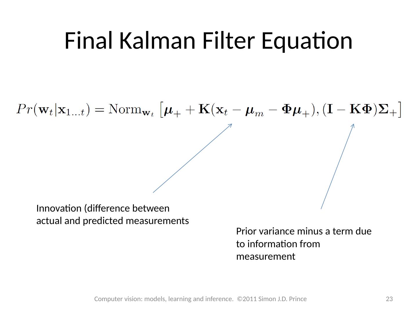 23 .Final Kalman Filter Equation Innovation (difference between actual and predicted measurements Prior variance minus a term due to information from measurement 23 Computer vision: models, learning and inference. ©2011 Simon J.D. Prince