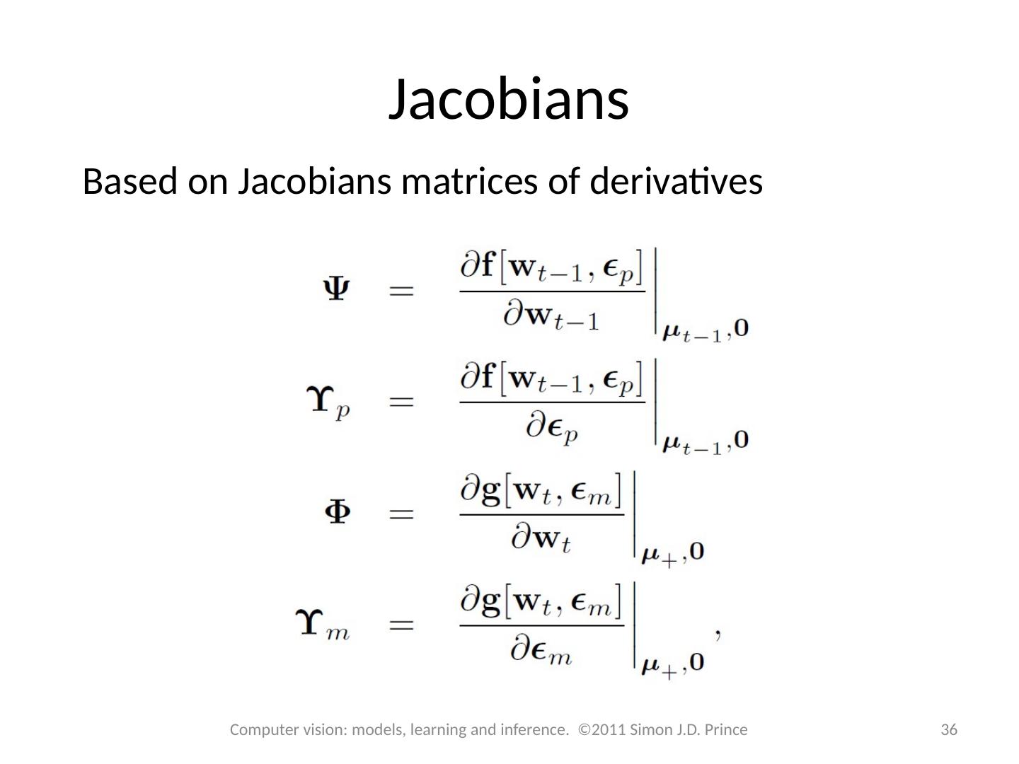 20 .Kalman Filter This is not the usual way these equations are presented. Part of the reason for this is the size of the inverses: f is usually landscape and so f T f is inefficient Define Kalman gain: 20 Computer vision: models, learning and inference. ©2011 Simon J.D. Prince