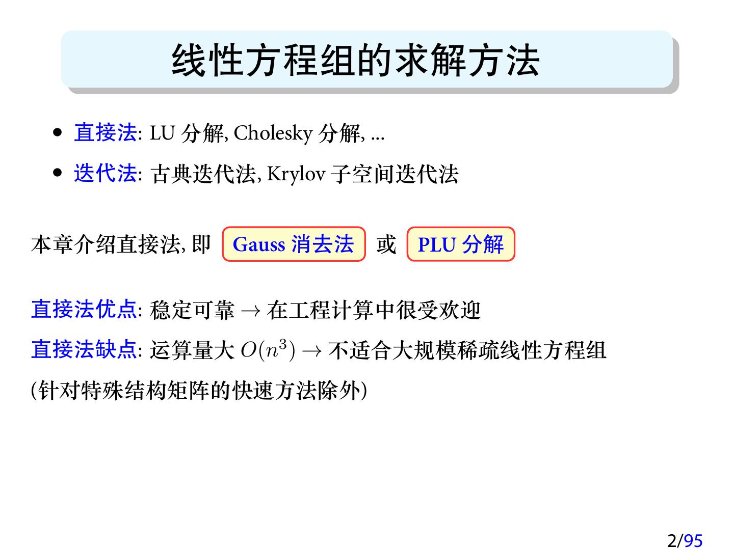 2 . 线性方程组的求解方法 • 直接法: LU 分解, Cholesky 分解, ... • 迭代法: 古典迭代法, Krylov 子空间迭代法 本章介绍直接法, 即 Gauss 消去法 或 PLU 分解 直接法优点: 稳定可靠 → 在工程计算中很受欢迎 直接法缺点: 运算量大 O(n3 ) → 不适合大规模稀疏线性方程组 (针对特殊结构矩阵的快速方法除外) 2/95