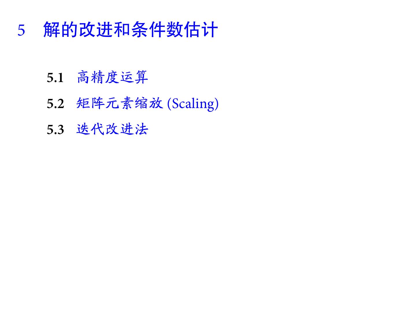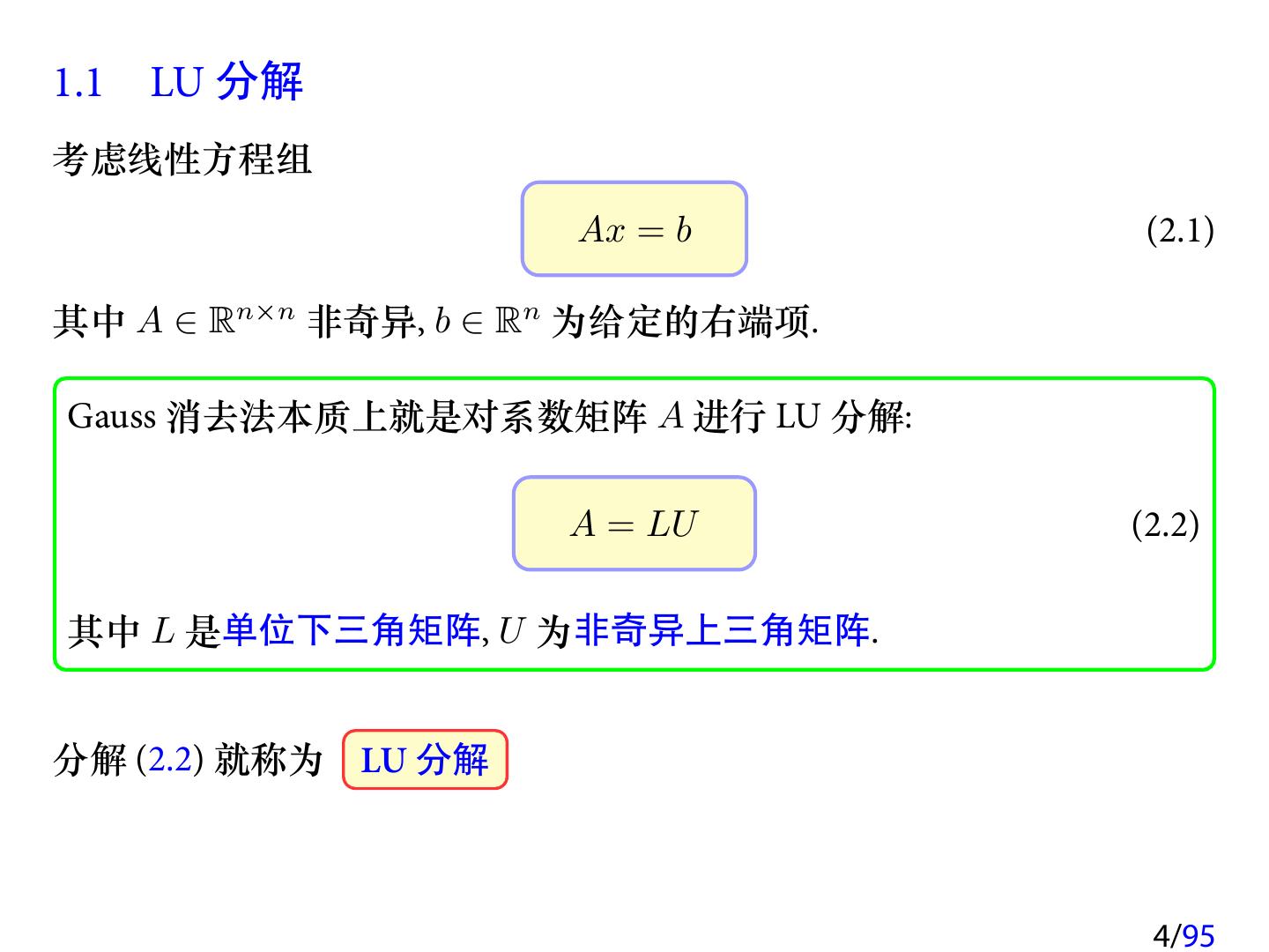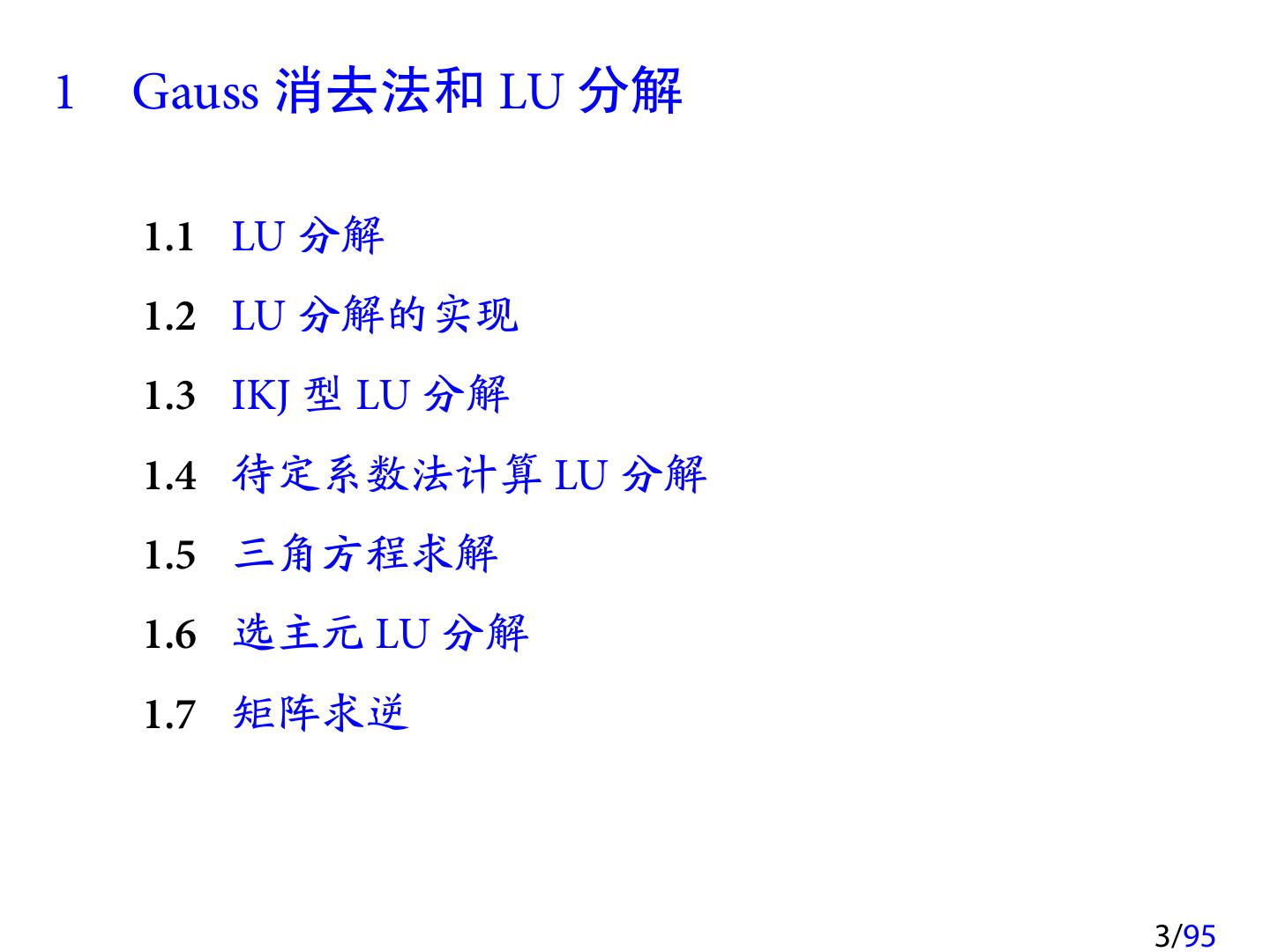 3 .1 Gauss 消去法和 LU 分解 1.1 LU 分解 1.2 LU 分解的实现 1.3 IKJ 型 LU 分解 1.4 待定系数法计算 LU 分解 1.5 三角方程求解 1.6 选主元 LU 分解 1.7 矩阵求逆 3/95