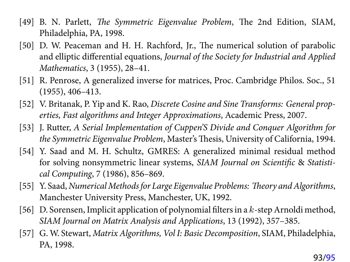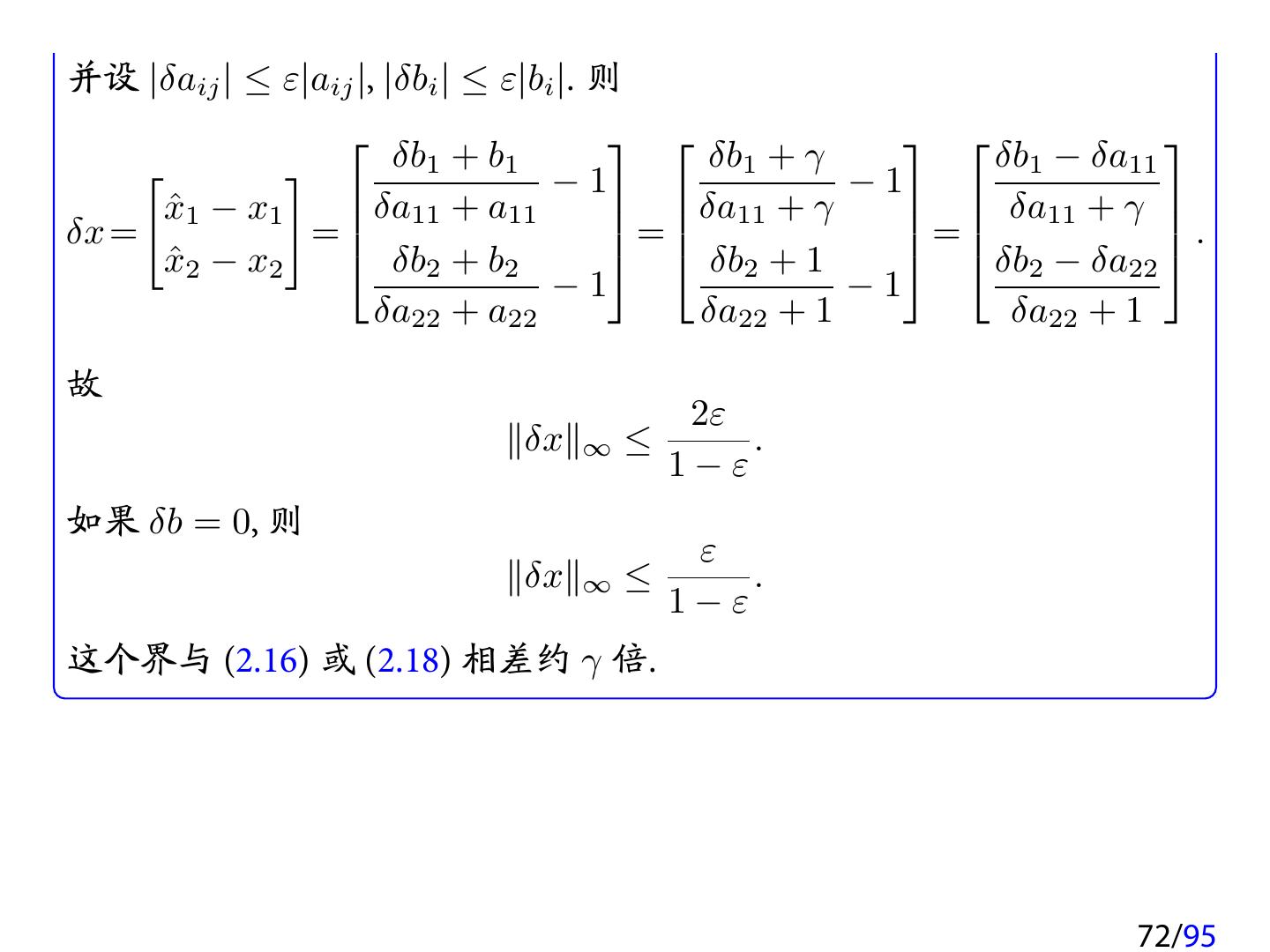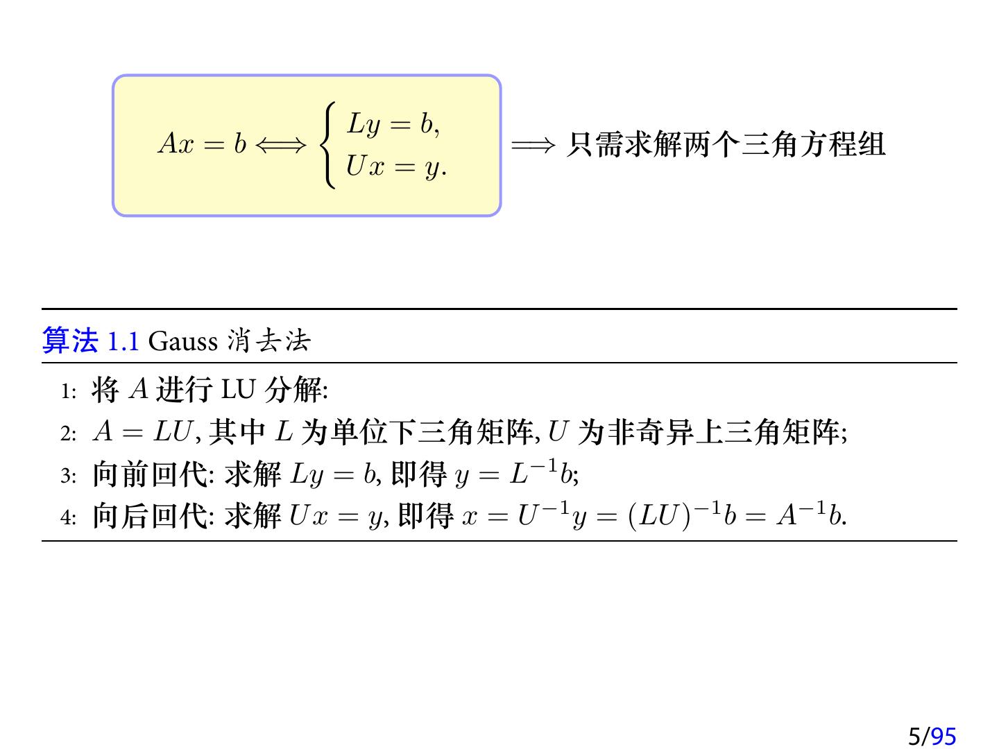 5 . { Ly = b, Ax = b ⇐⇒ =⇒ 只需求解两个三角方程组 U x = y. 算法 1.1 Gauss 消去法 1: 将 A 进行 LU 分解: 2: A = LU , 其中 L 为单位下三角矩阵, U 为非奇异上三角矩阵; 3: 向前回代: 求解 Ly = b, 即得 y = L−1 b; 4: 向后回代: 求解 U x = y, 即得 x = U −1 y = (LU )−1 b = A−1 b. 5/95