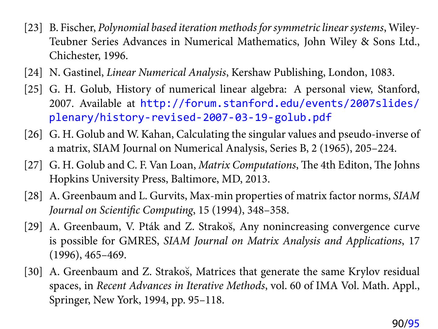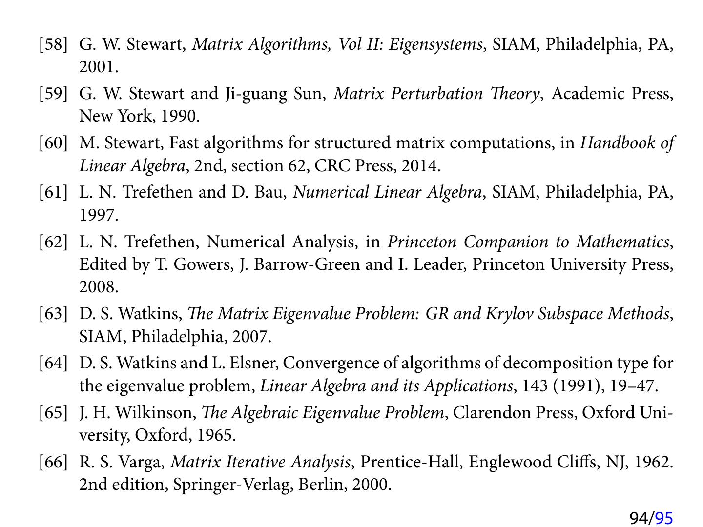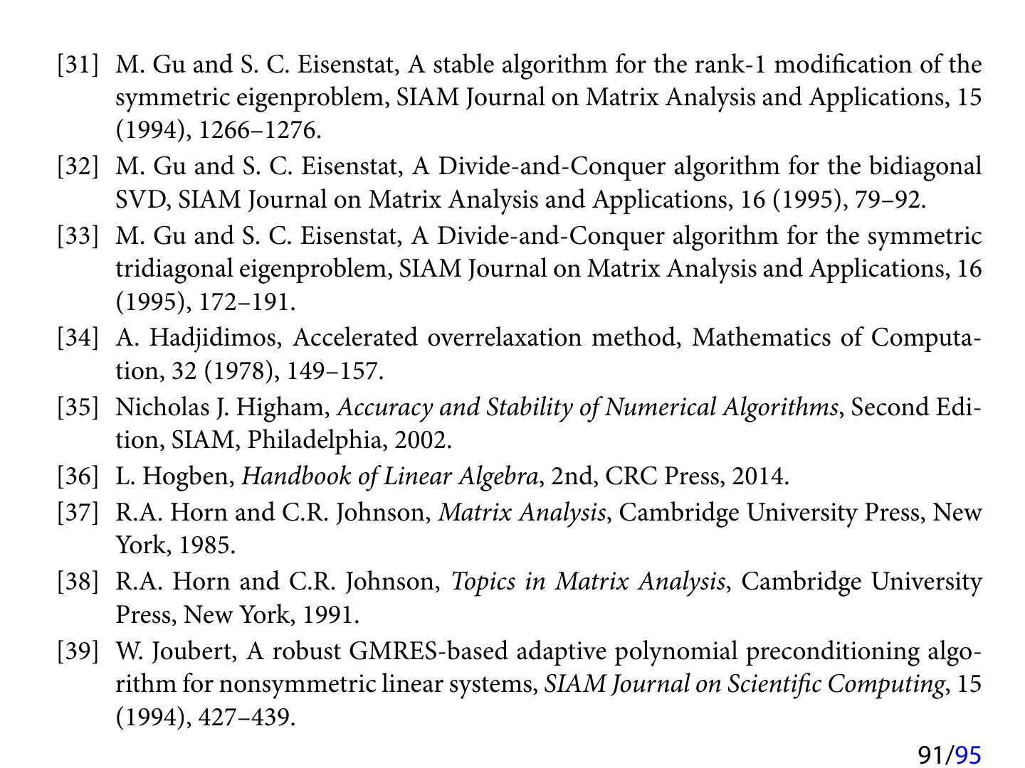 5 . { Ly = b, Ax = b ⇐⇒ =⇒ 只需求解两个三角方程组 U x = y. 算法 1.1 Gauss 消去法 1: 将 A 进行 LU 分解: 2: A = LU , 其中 L 为单位下三角矩阵, U 为非奇异上三角矩阵; 3: 向前回代: 求解 Ly = b, 即得 y = L−1 b; 4: 向后回代: 求解 U x = y, 即得 x = U −1 y = (LU )−1 b = A−1 b. 5/95