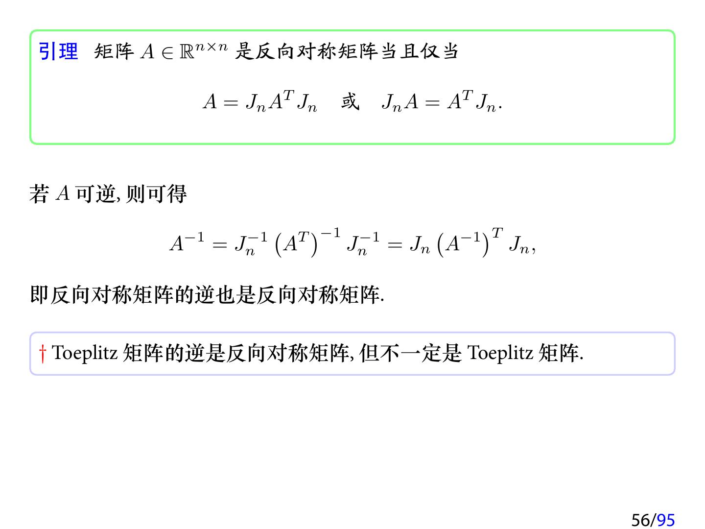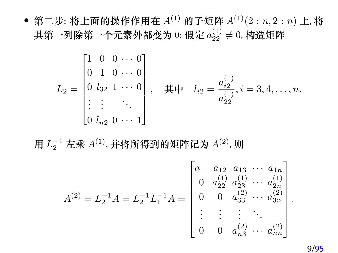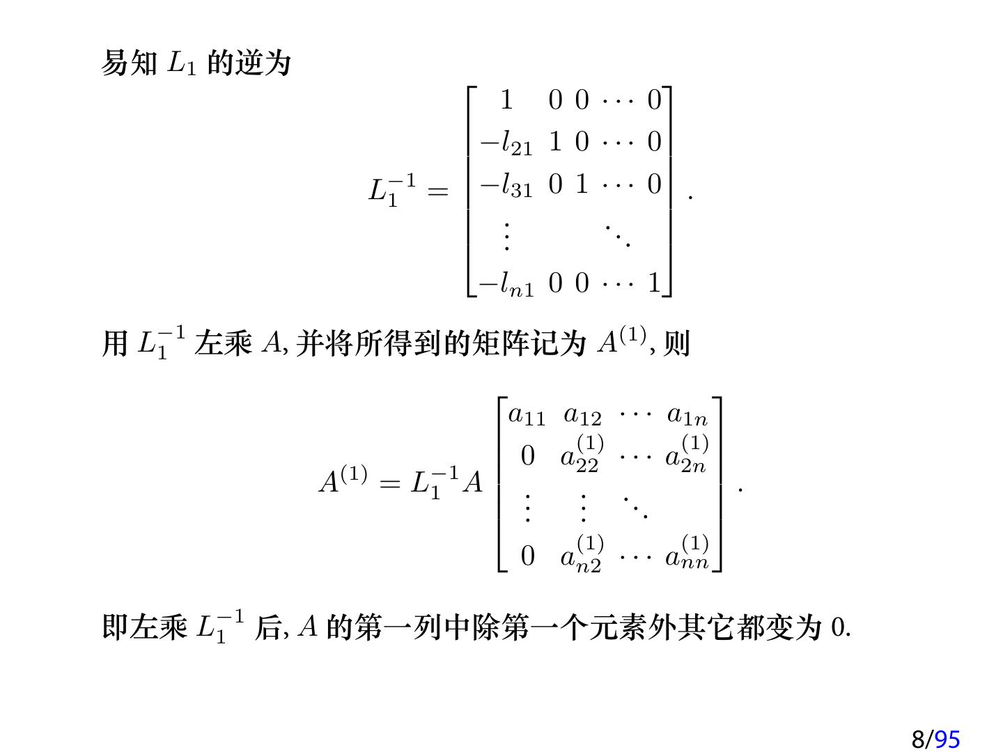 8 .易知 L1 的逆为 1 0 0 ··· 0 −l 1 0 ··· 0 21 L−1 1 = −l 31 0 1 ··· 0 . .. .. . . −ln1 0 0 ··· 1 用 L−1 1 左乘 A, 并将所得到的矩阵记为 A (1) ,则 a11 a12 · · · a1n (1) (1) 0 a22 · · · a2n A(1) = L−1 A . . 1 . .. .. . . . (1) (1) 0 an2 · · · ann 即左乘 L−1 1 后, A 的第一列中除第一个元素外其它都变为 0. 8/95