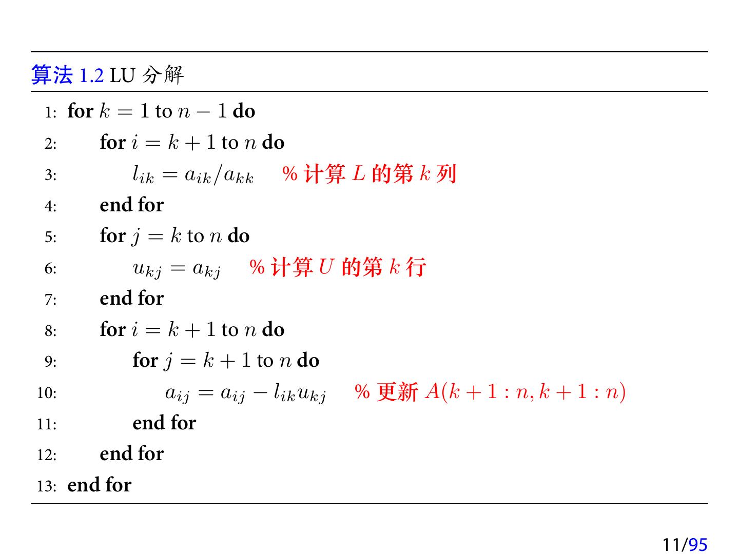 11 .算法 1.2 LU 分解 1: for k = 1 to n − 1 do 2: for i = k + 1 to n do 3: lik = aik /akk % 计算 L 的第 k 列 4: end for 5: for j = k to n do 6: ukj = akj % 计算 U 的第 k 行 7: end for 8: for i = k + 1 to n do 9: for j = k + 1 to n do 10: aij = aij − lik ukj % 更新 A(k + 1 : n, k + 1 : n) 11: end for 12: end for 13: end for 11/95