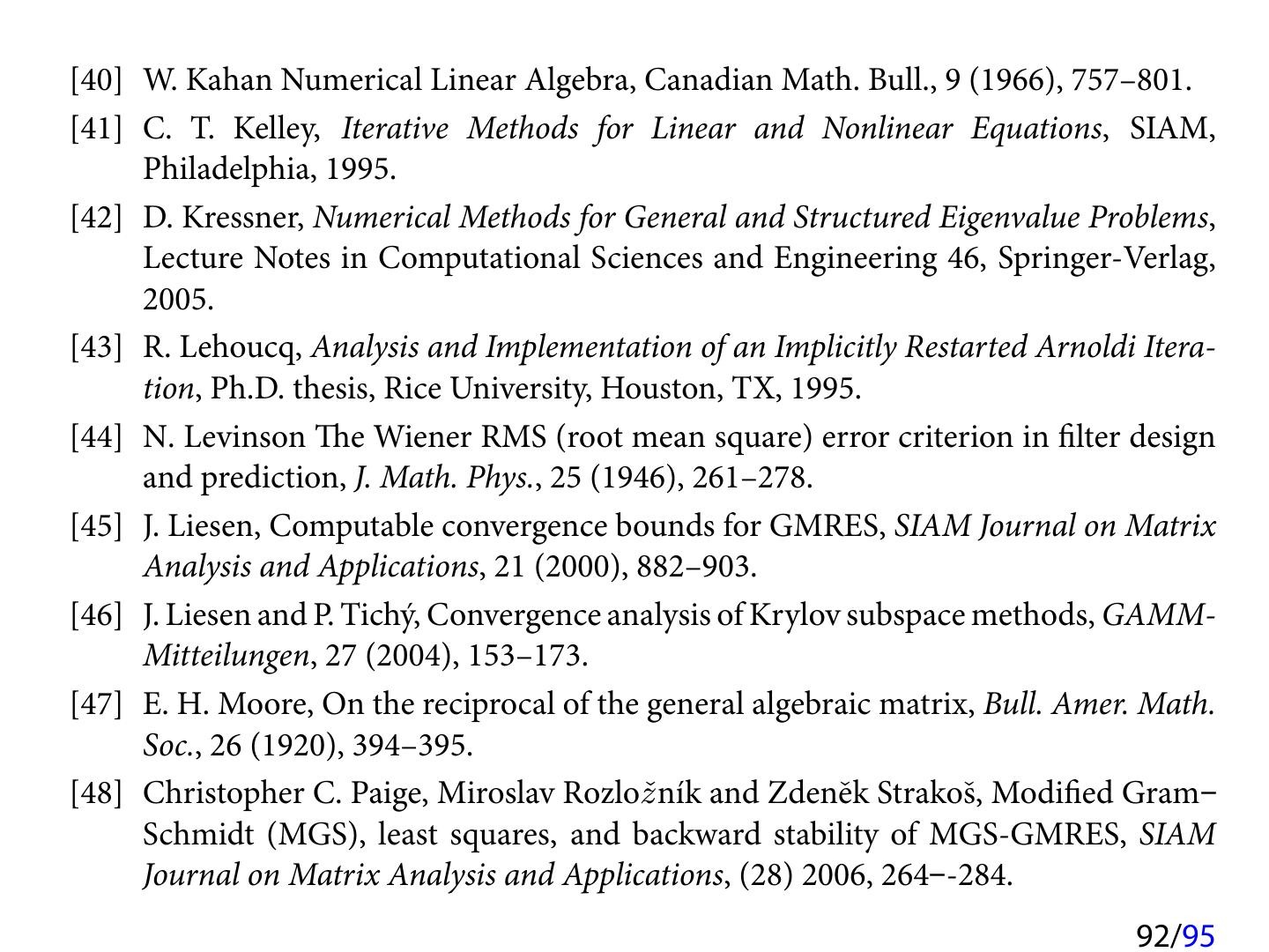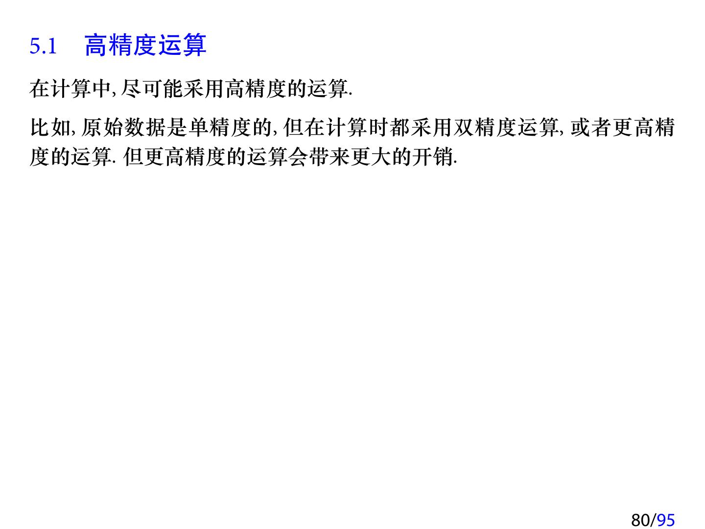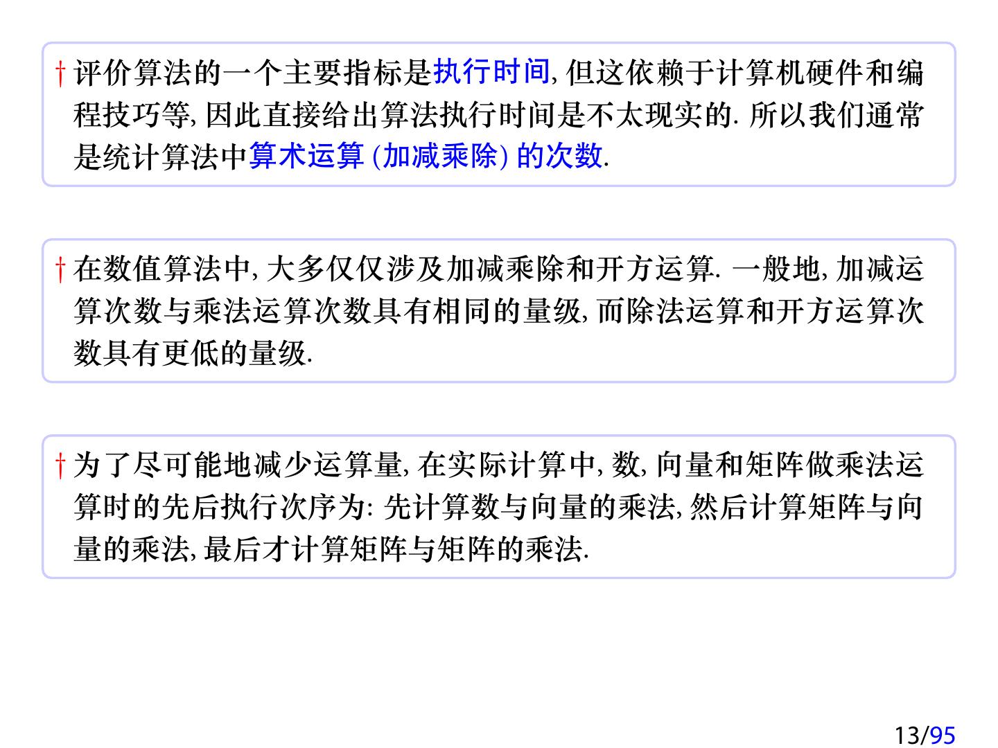 13 .† 评价算法的一个主要指标是执行时间, 但这依赖于计算机硬件和编 程技巧等, 因此直接给出算法执行时间是不太现实的. 所以我们通常 是统计算法中算术运算 (加减乘除) 的次数. † 在数值算法中, 大多仅仅涉及加减乘除和开方运算. 一般地, 加减运 算次数与乘法运算次数具有相同的量级, 而除法运算和开方运算次 数具有更低的量级. † 为了尽可能地减少运算量, 在实际计算中, 数, 向量和矩阵做乘法运 算时的先后执行次序为: 先计算数与向量的乘法, 然后计算矩阵与向 量的乘法, 最后才计算矩阵与矩阵的乘法. 13/95