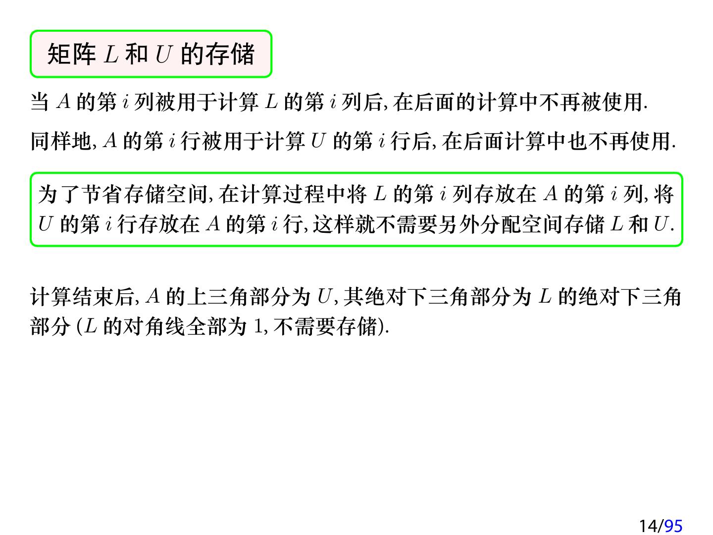 14 . 矩阵 L 和 U 的存储 当 A 的第 i 列被用于计算 L 的第 i 列后, 在后面的计算中不再被使用. 同样地, A 的第 i 行被用于计算 U 的第 i 行后, 在后面计算中也不再使用. 为了节省存储空间, 在计算过程中将 L 的第 i 列存放在 A 的第 i 列, 将 U 的第 i 行存放在 A 的第 i 行, 这样就不需要另外分配空间存储 L 和 U . 计算结束后, A 的上三角部分为 U , 其绝对下三角部分为 L 的绝对下三角 部分 (L 的对角线全部为 1, 不需要存储). 14/95
