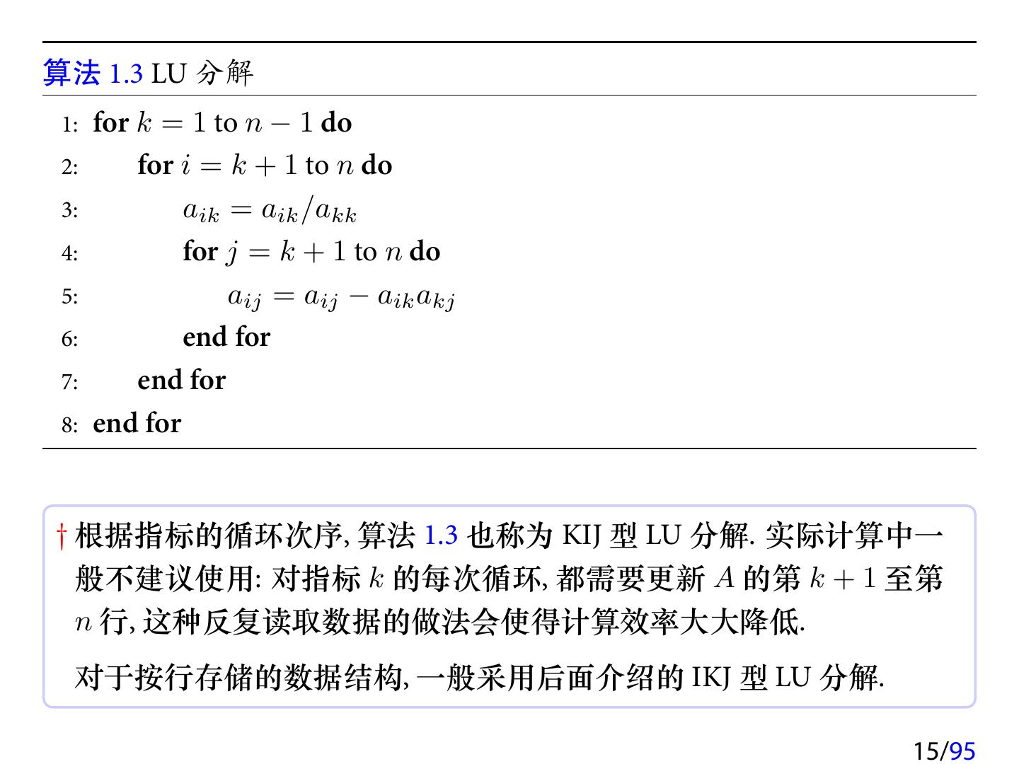 15 .算法 1.3 LU 分解 1: for k = 1 to n − 1 do 2: for i = k + 1 to n do 3: aik = aik /akk 4: for j = k + 1 to n do 5: aij = aij − aik akj 6: end for 7: end for 8: end for † 根据指标的循环次序, 算法 1.3 也称为 KIJ 型 LU 分解. 实际计算中一 般不建议使用: 对指标 k 的每次循环, 都需要更新 A 的第 k + 1 至第 n 行, 这种反复读取数据的做法会使得计算效率大大降低. 对于按行存储的数据结构, 一般采用后面介绍的 IKJ 型 LU 分解. 15/95