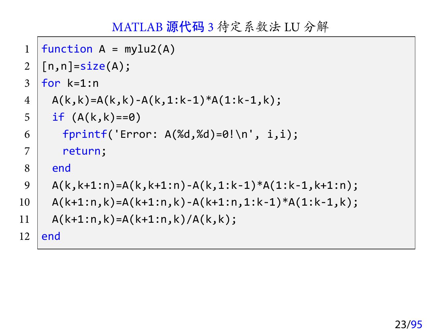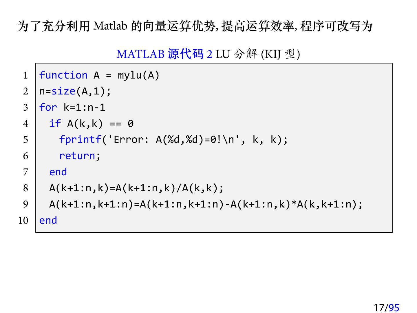 17 .为了充分利用 Matlab 的向量运算优势, 提高运算效率, 程序可改写为 MATLAB 源代码 2 LU 分解 (KIJ 型) 1 function A = mylu(A) 2 n=size(A,1); 3 for k=1:n-1 4 if A(k,k) == 0 5 fprintf('Error: A(%d,%d)=0!\n', k, k); 6 return; 7 end 8 A(k+1:n,k)=A(k+1:n,k)/A(k,k); 9 A(k+1:n,k+1:n)=A(k+1:n,k+1:n)-A(k+1:n,k)*A(k,k+1:n); 10 end 17/95