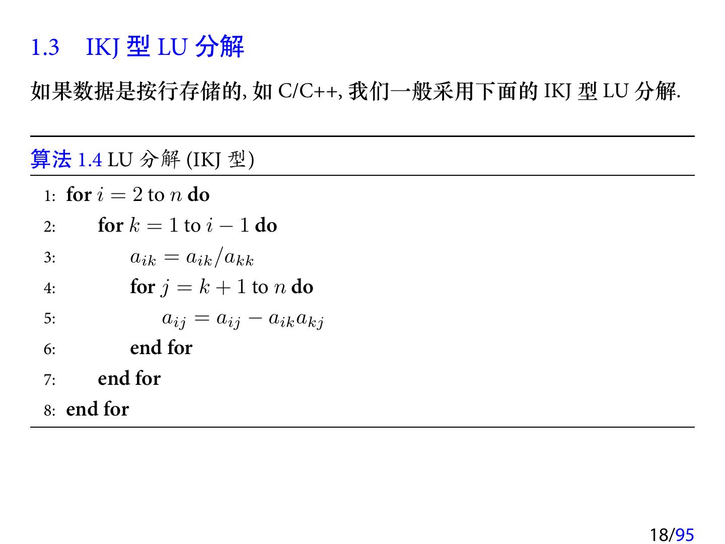 18 .1.3 IKJ 型 LU 分解 如果数据是按行存储的, 如 C/C++, 我们一般采用下面的 IKJ 型 LU 分解. 算法 1.4 LU 分解 (IKJ 型) 1: for i = 2 to n do 2: for k = 1 to i − 1 do 3: aik = aik /akk 4: for j = k + 1 to n do 5: aij = aij − aik akj 6: end for 7: end for 8: end for 18/95