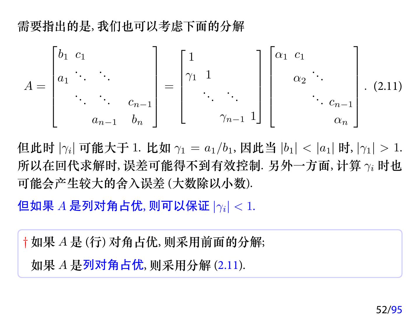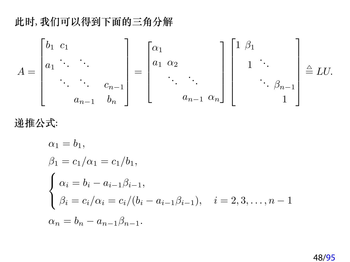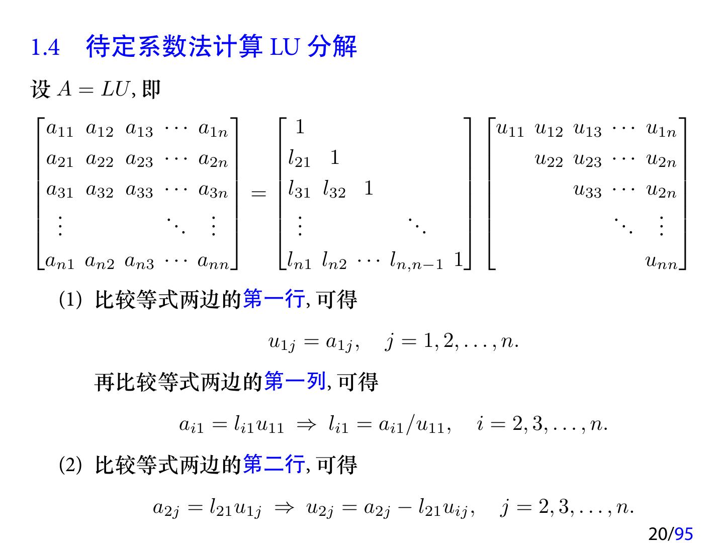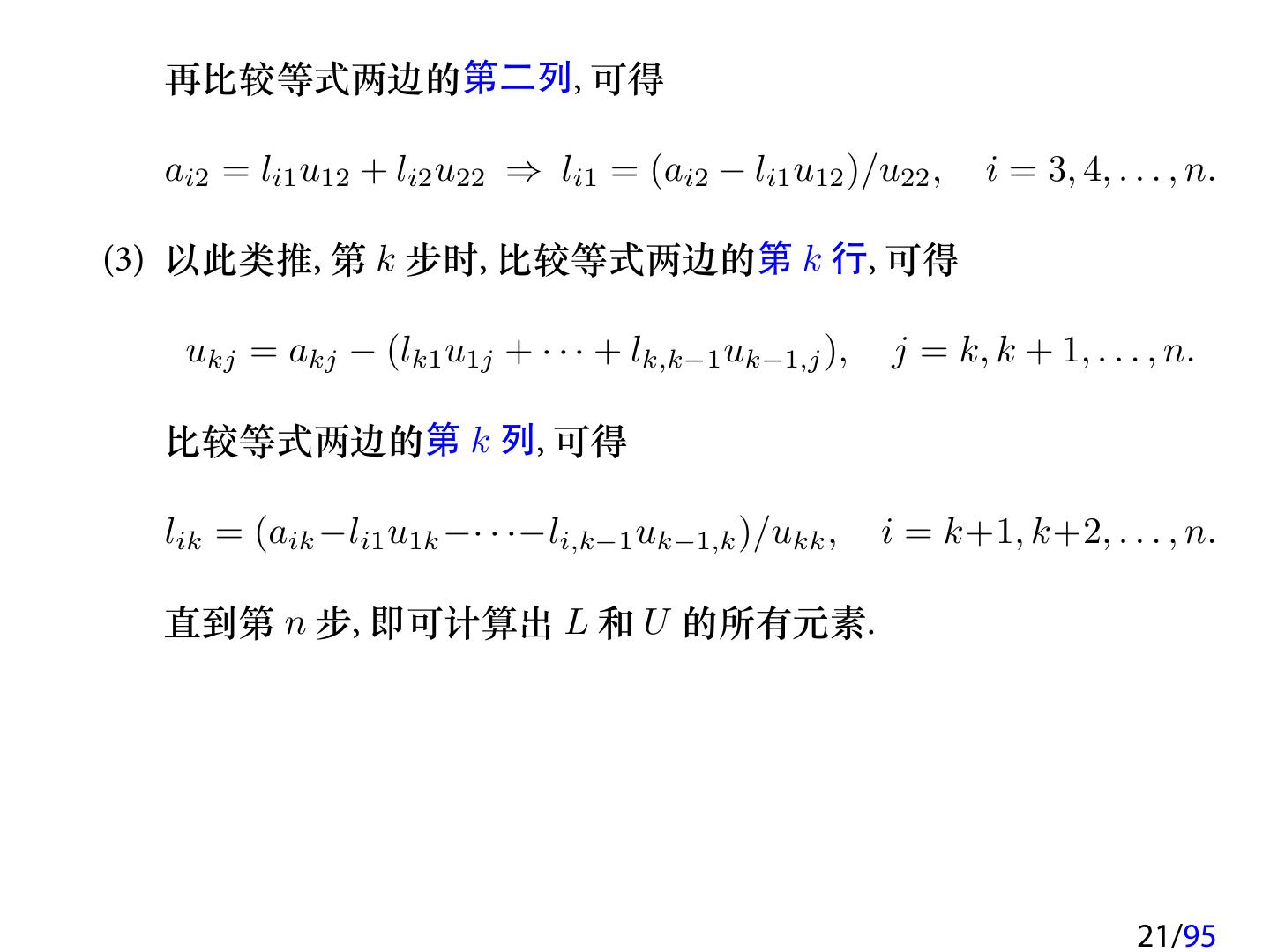 21 . 再比较等式两边的第二列, 可得 ai2 = li1 u12 + li2 u22 ⇒ li1 = (ai2 − li1 u12 )/u22 , i = 3, 4, . . . , n. (3) 以此类推, 第 k 步时, 比较等式两边的第 k 行, 可得 ukj = akj − (lk1 u1j + · · · + lk,k−1 uk−1,j ), j = k, k + 1, . . . , n. 比较等式两边的第 k 列, 可得 lik = (aik −li1 u1k −· · ·−li,k−1 uk−1,k )/ukk , i = k+1, k+2, . . . , n. 直到第 n 步, 即可计算出 L 和 U 的所有元素. 21/95