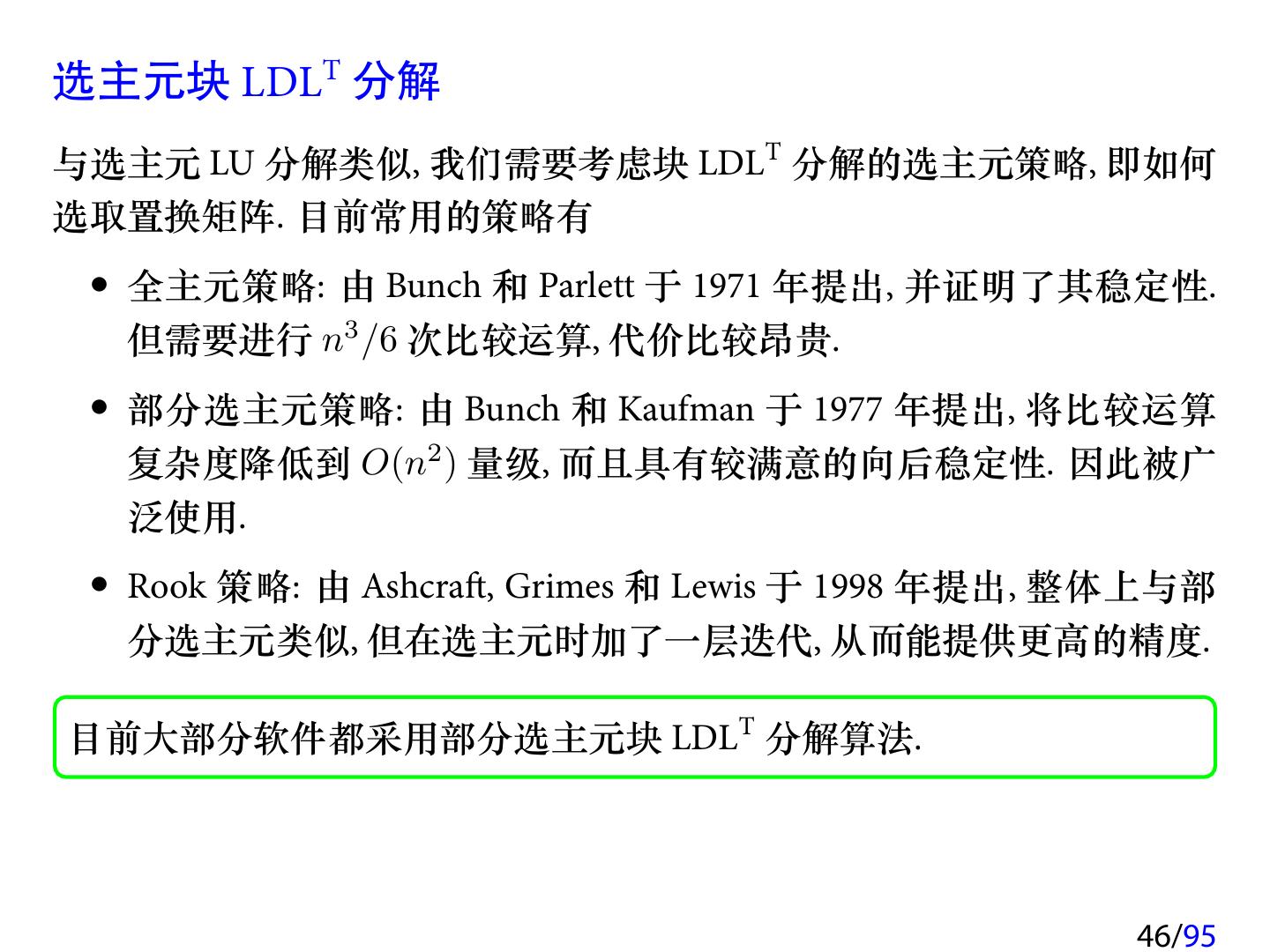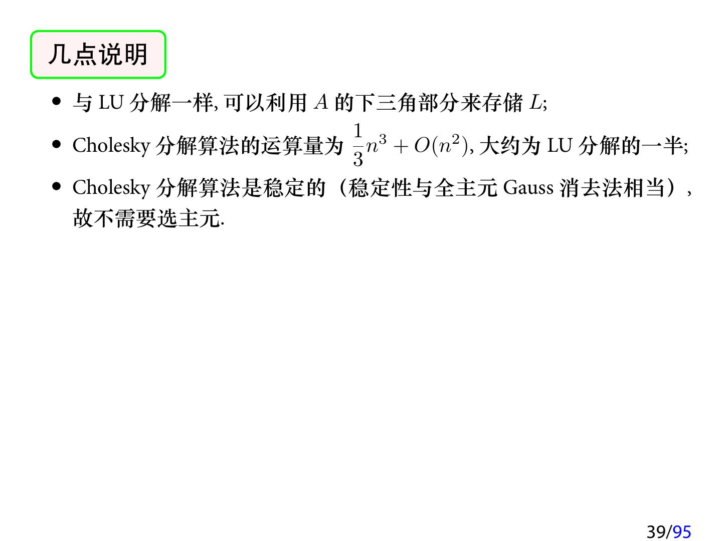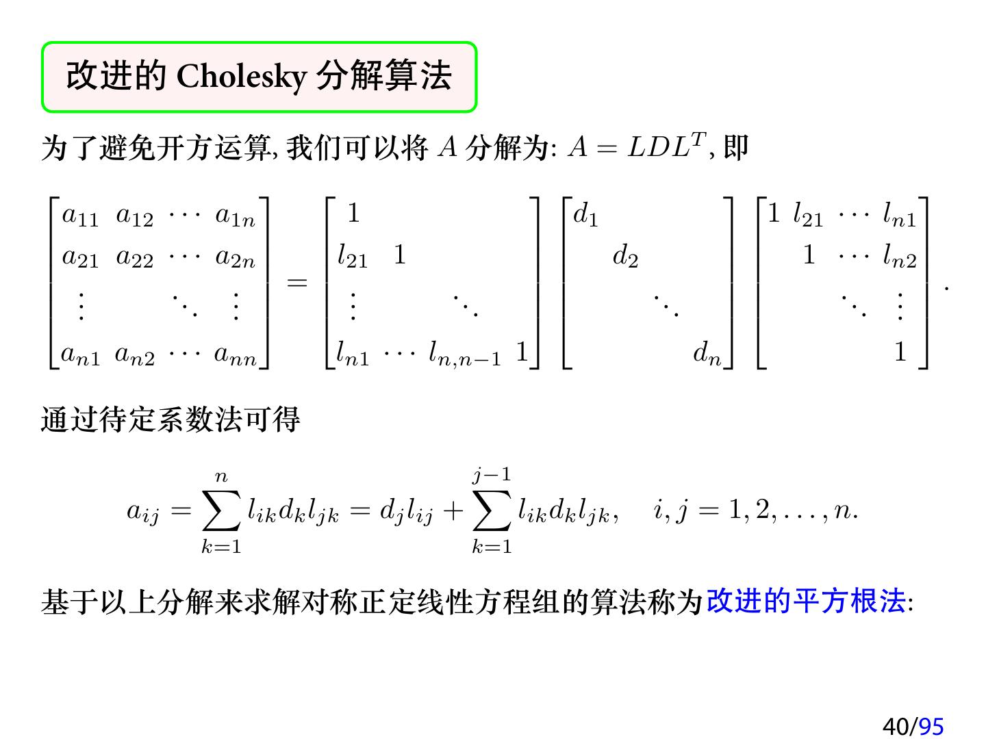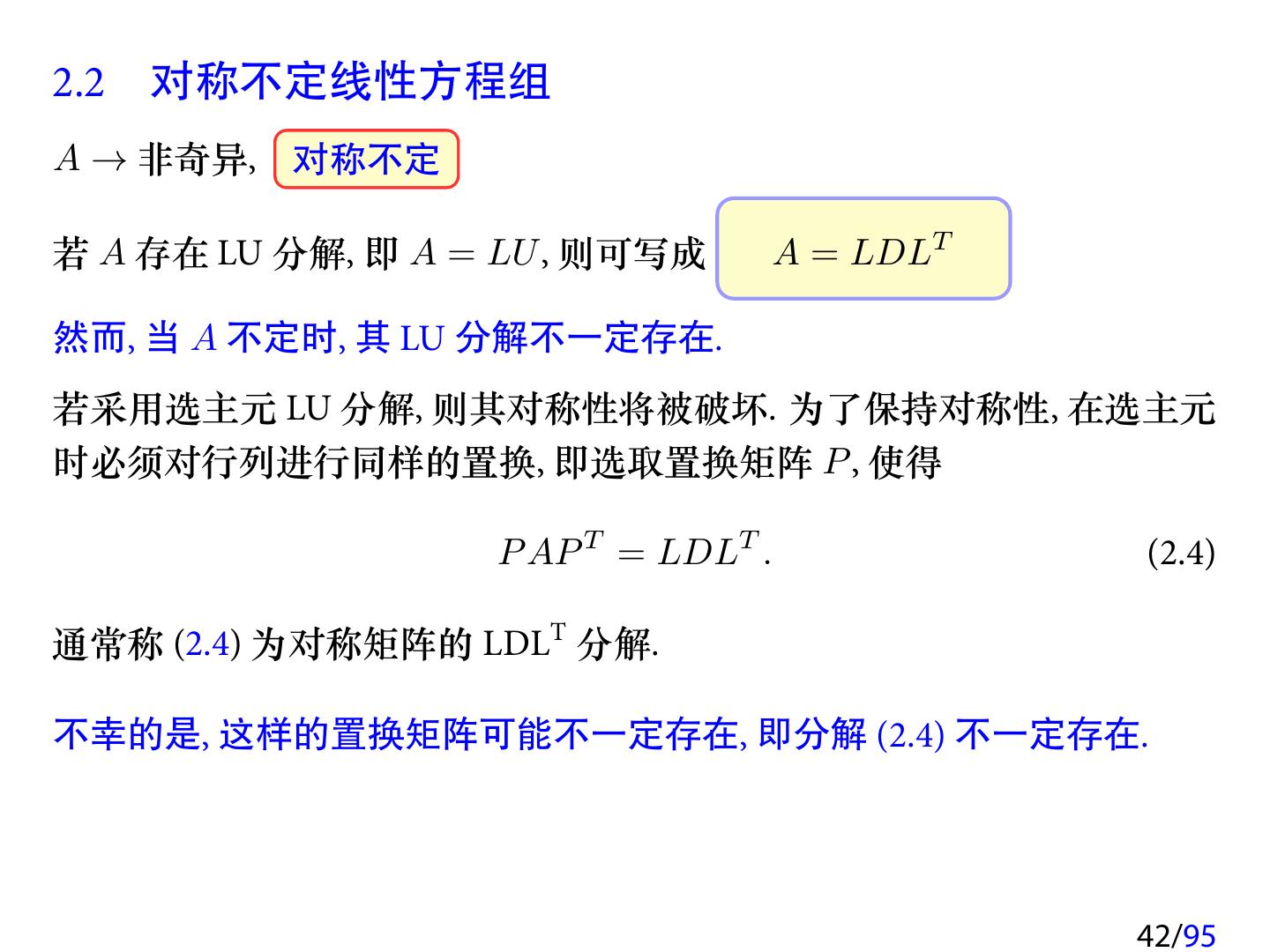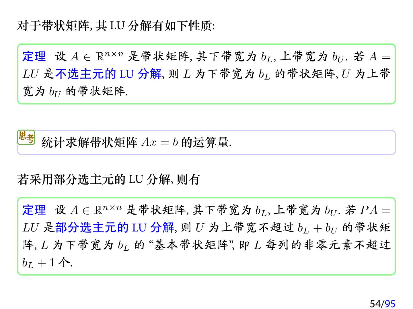 21 . 再比较等式两边的第二列, 可得 ai2 = li1 u12 + li2 u22 ⇒ li1 = (ai2 − li1 u12 )/u22 , i = 3, 4, . . . , n. (3) 以此类推, 第 k 步时, 比较等式两边的第 k 行, 可得 ukj = akj − (lk1 u1j + · · · + lk,k−1 uk−1,j ), j = k, k + 1, . . . , n. 比较等式两边的第 k 列, 可得 lik = (aik −li1 u1k −· · ·−li,k−1 uk−1,k )/ukk , i = k+1, k+2, . . . , n. 直到第 n 步, 即可计算出 L 和 U 的所有元素. 21/95