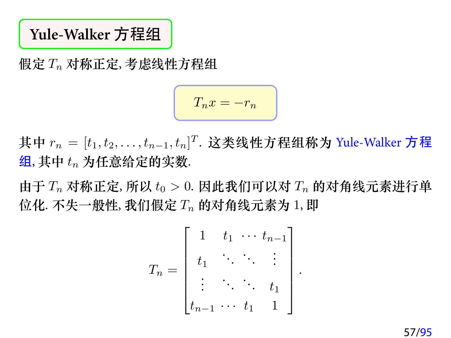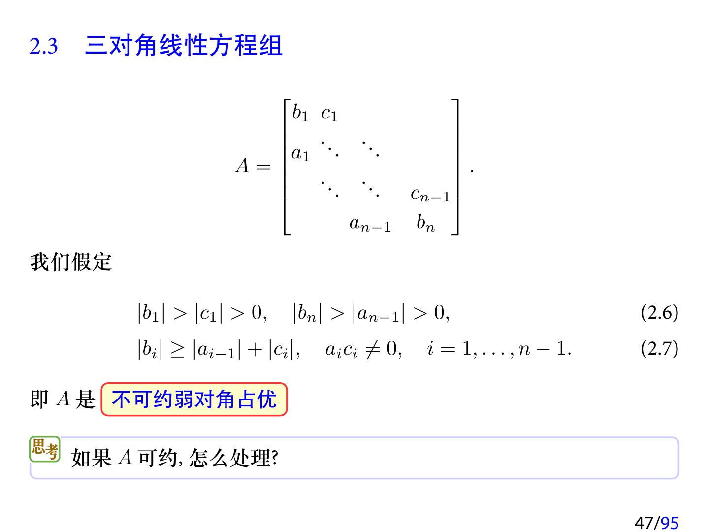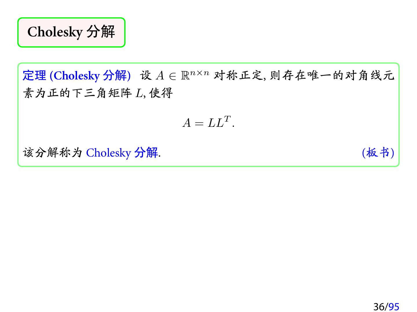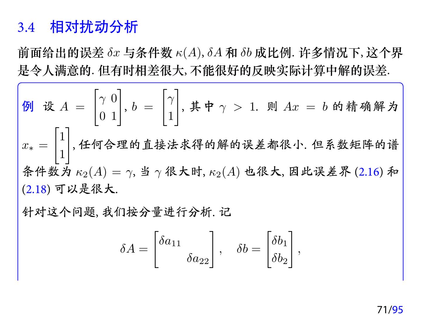 21 . 再比较等式两边的第二列, 可得 ai2 = li1 u12 + li2 u22 ⇒ li1 = (ai2 − li1 u12 )/u22 , i = 3, 4, . . . , n. (3) 以此类推, 第 k 步时, 比较等式两边的第 k 行, 可得 ukj = akj − (lk1 u1j + · · · + lk,k−1 uk−1,j ), j = k, k + 1, . . . , n. 比较等式两边的第 k 列, 可得 lik = (aik −li1 u1k −· · ·−li,k−1 uk−1,k )/ukk , i = k+1, k+2, . . . , n. 直到第 n 步, 即可计算出 L 和 U 的所有元素. 21/95