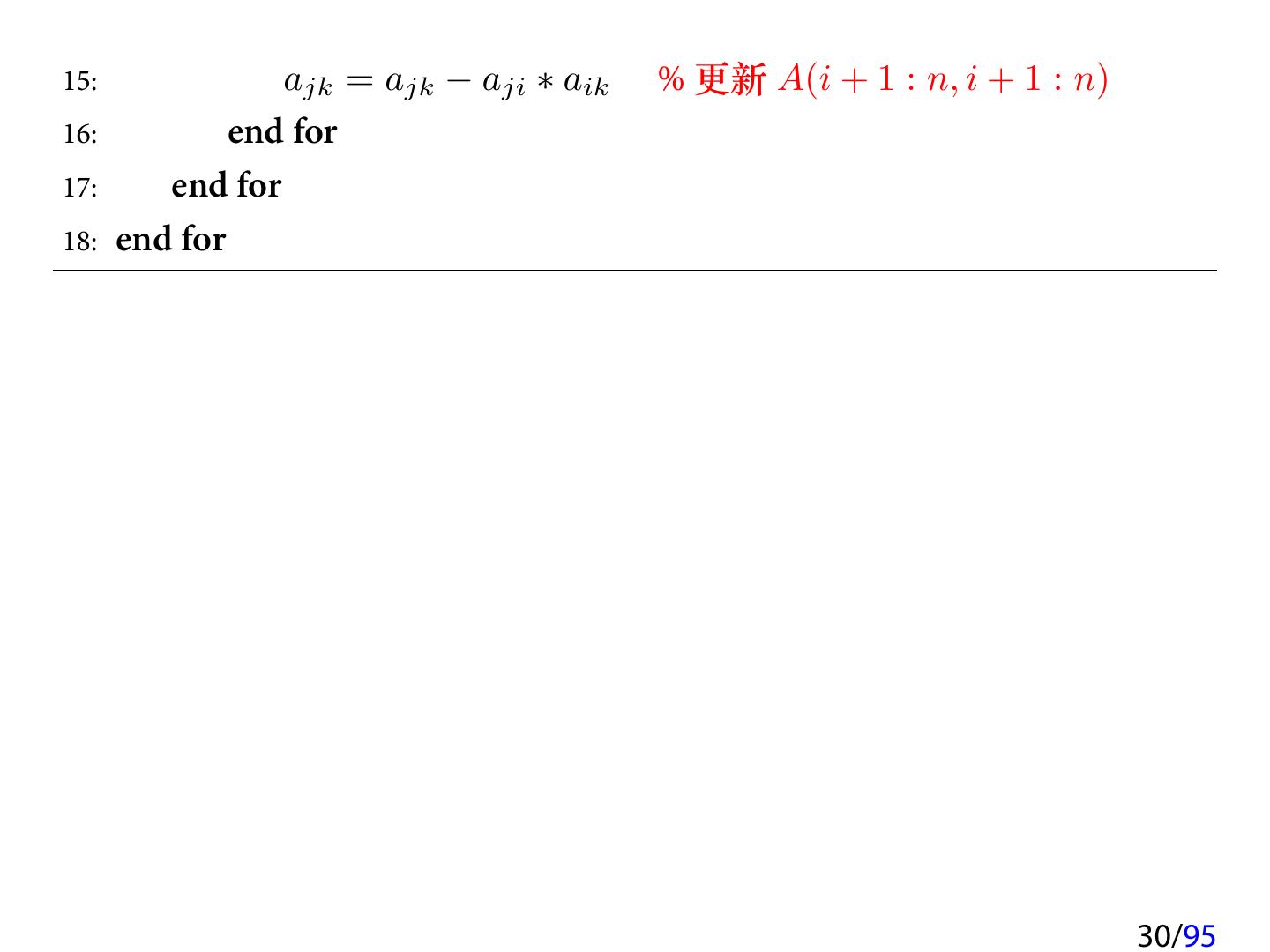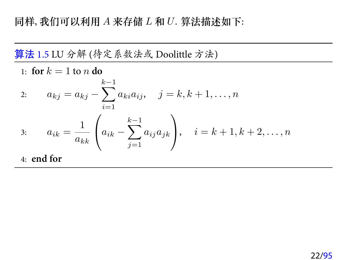 22 .同样, 我们可以利用 A 来存储 L 和 U . 算法描述如下: 算法 1.5 LU 分解 (待定系数法或 Doolittle 方法) 1: for k = 1 to n do ∑ k−1 2: akj = akj − aki aij , j = k, k + 1, . . . , n i=1 1 ∑ k−1 3: aik = aik − aij ajk , i = k + 1, k + 2, . . . , n akk j=1 4: end for 22/95
