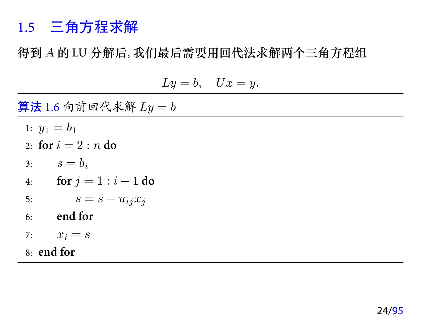 24 .1.5 三角方程求解 得到 A 的 LU 分解后, 我们最后需要用回代法求解两个三角方程组 Ly = b, U x = y. 算法 1.6 向前回代求解 Ly = b 1: y1 = b1 2: for i = 2 : n do 3: s = bi 4: for j = 1 : i − 1 do 5: s = s − uij xj 6: end for 7: xi = s 8: end for 24/95