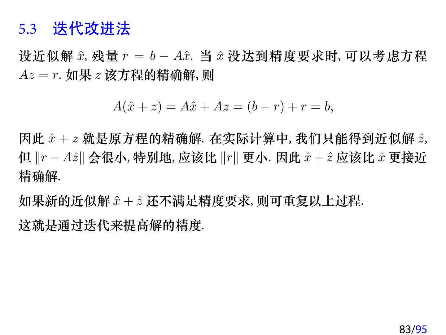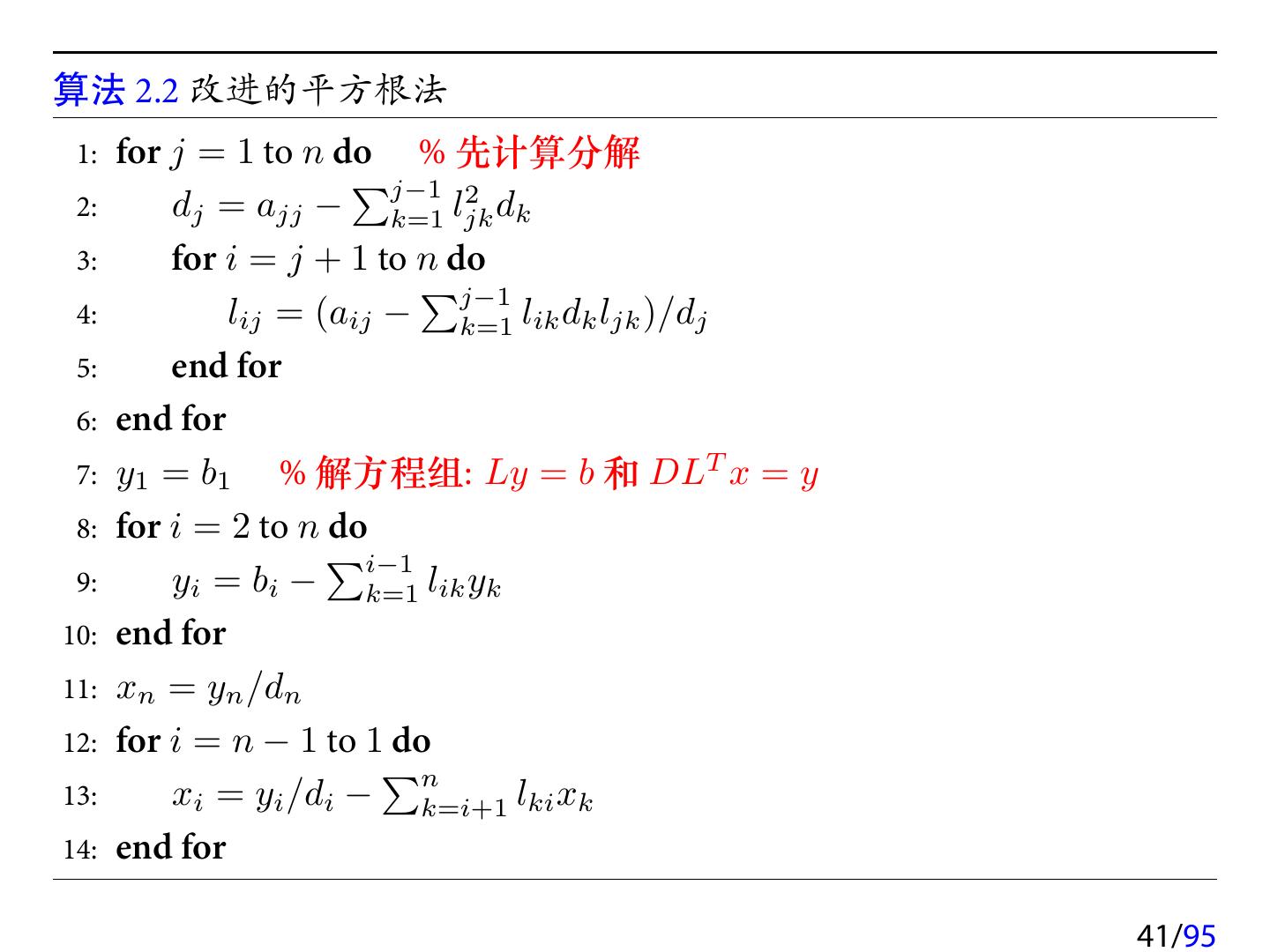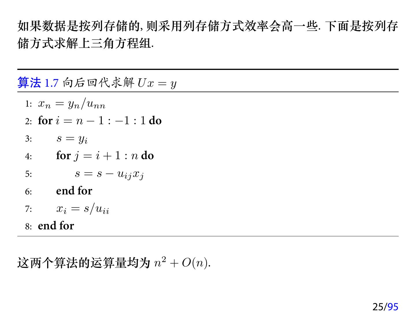 25 .如果数据是按列存储的, 则采用列存储方式效率会高一些. 下面是按列存 储方式求解上三角方程组. 算法 1.7 向后回代求解 U x = y 1: xn = yn /unn 2: for i = n − 1 : −1 : 1 do 3: s = yi 4: for j = i + 1 : n do 5: s = s − uij xj 6: end for 7: xi = s/uii 8: end for 这两个算法的运算量均为 n2 + O(n). 25/95
