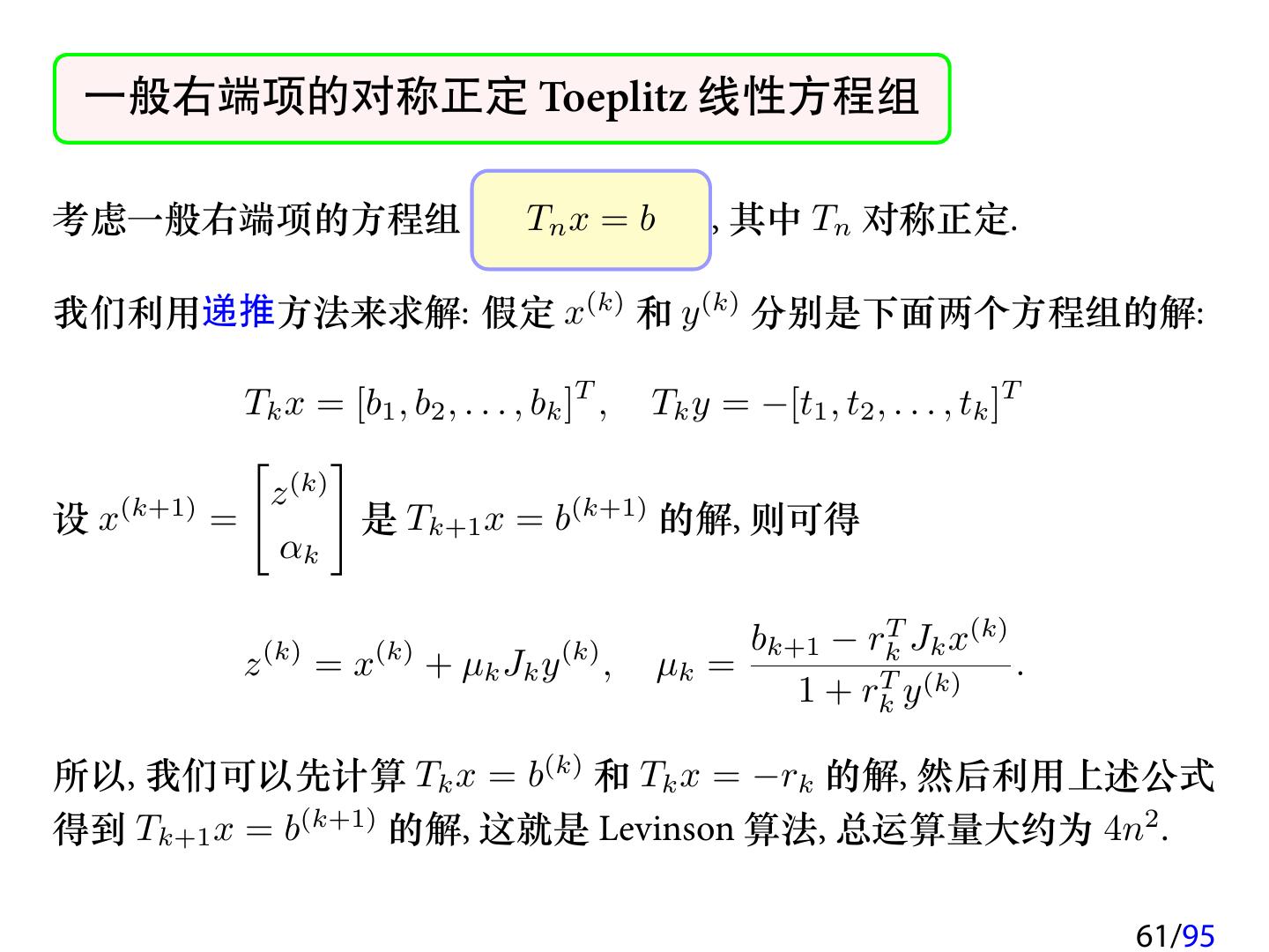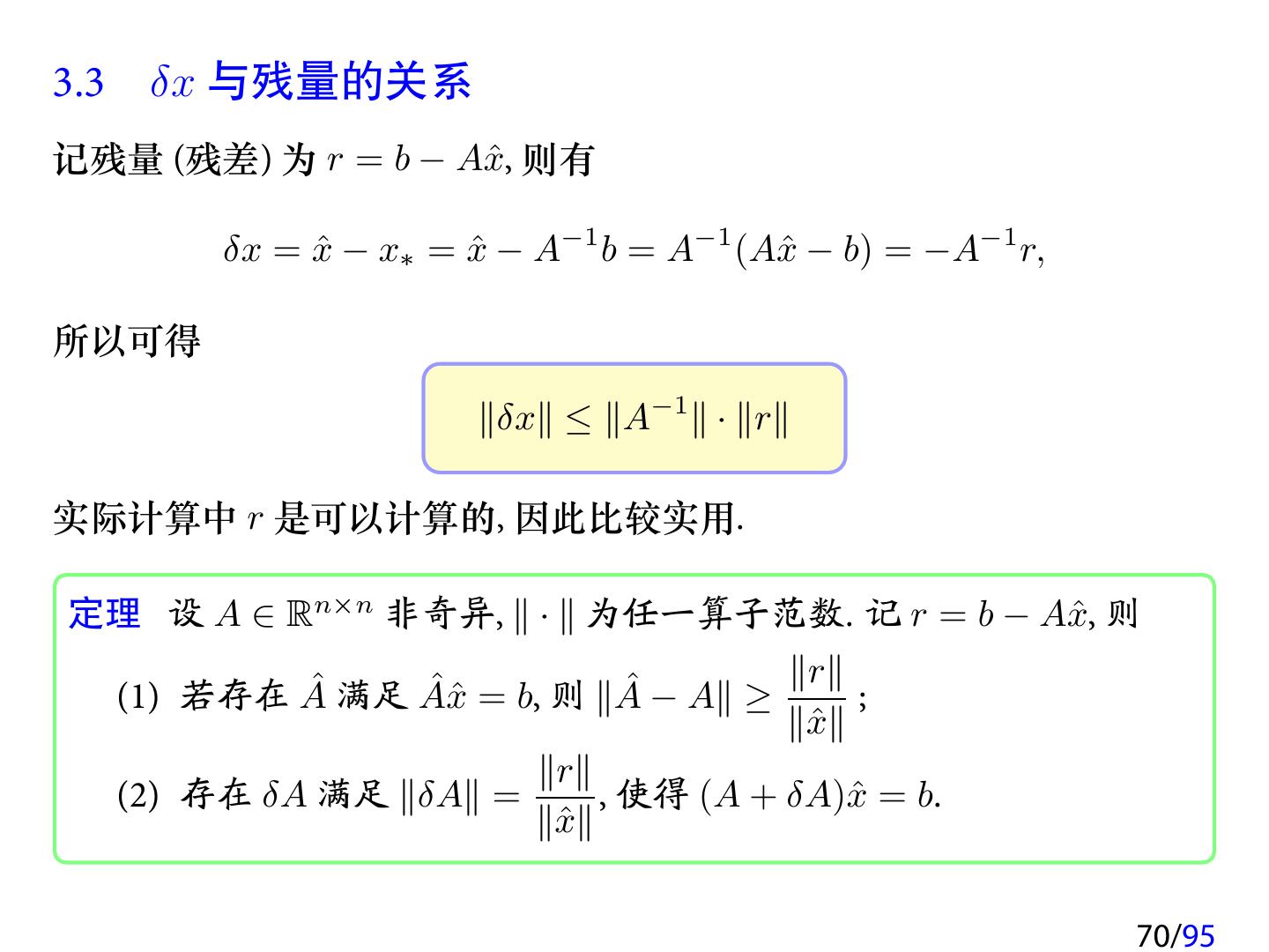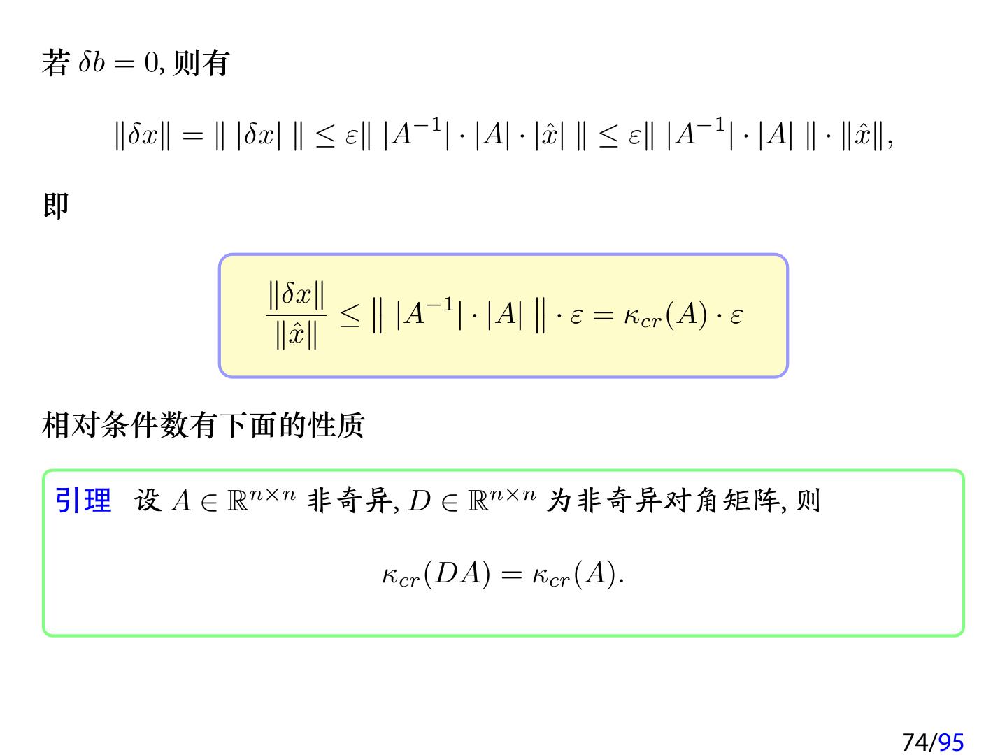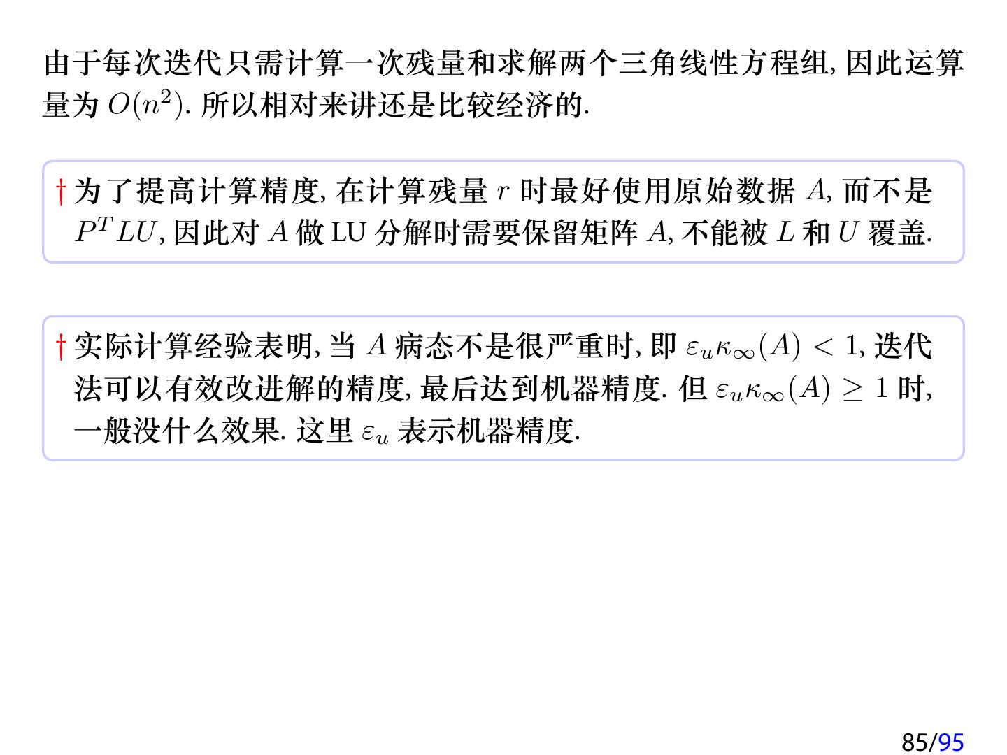 25 .如果数据是按列存储的, 则采用列存储方式效率会高一些. 下面是按列存 储方式求解上三角方程组. 算法 1.7 向后回代求解 U x = y 1: xn = yn /unn 2: for i = n − 1 : −1 : 1 do 3: s = yi 4: for j = i + 1 : n do 5: s = s − uij xj 6: end for 7: xi = s/uii 8: end for 这两个算法的运算量均为 n2 + O(n). 25/95