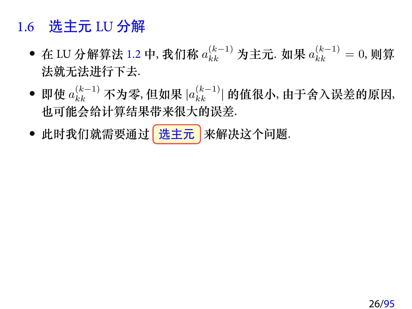 26 .1.6 选主元 LU 分解 • 在 LU 分解算法 1.2 中, 我们称 a(k−1) kk (k−1) 为主元. 如果 akk = 0, 则算 法就无法进行下去. • 即使 a(k−1) kk (k−1) 不为零, 但如果 |akk | 的值很小, 由于舍入误差的原因, 也可能会给计算结果带来很大的误差. • 此时我们就需要通过 选主元 来解决这个问题. 26/95