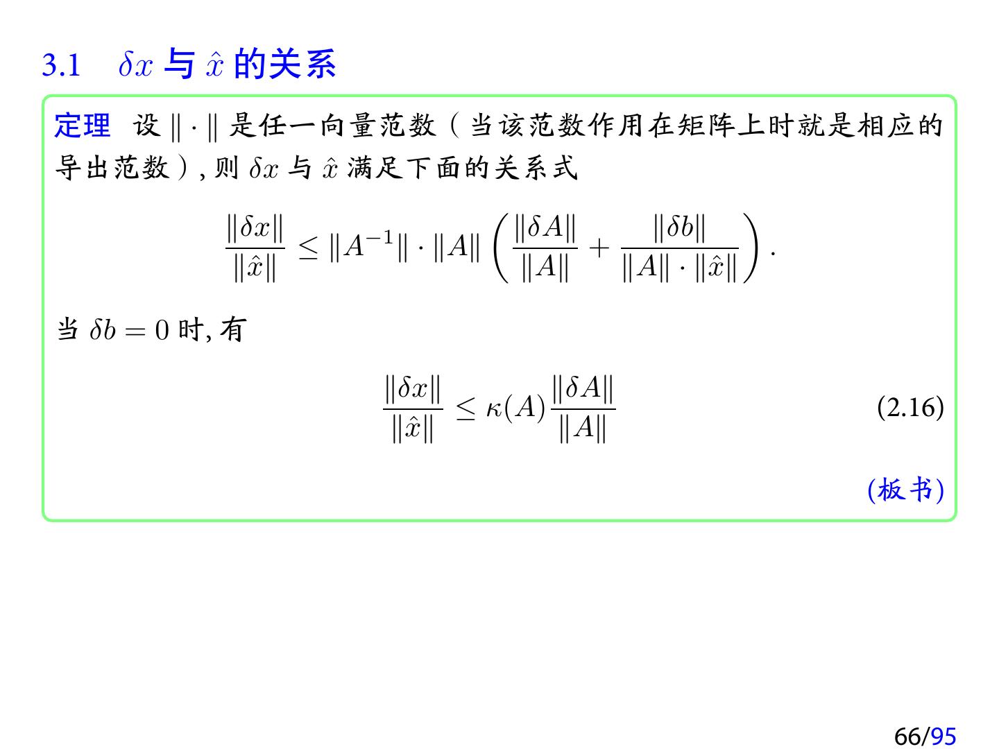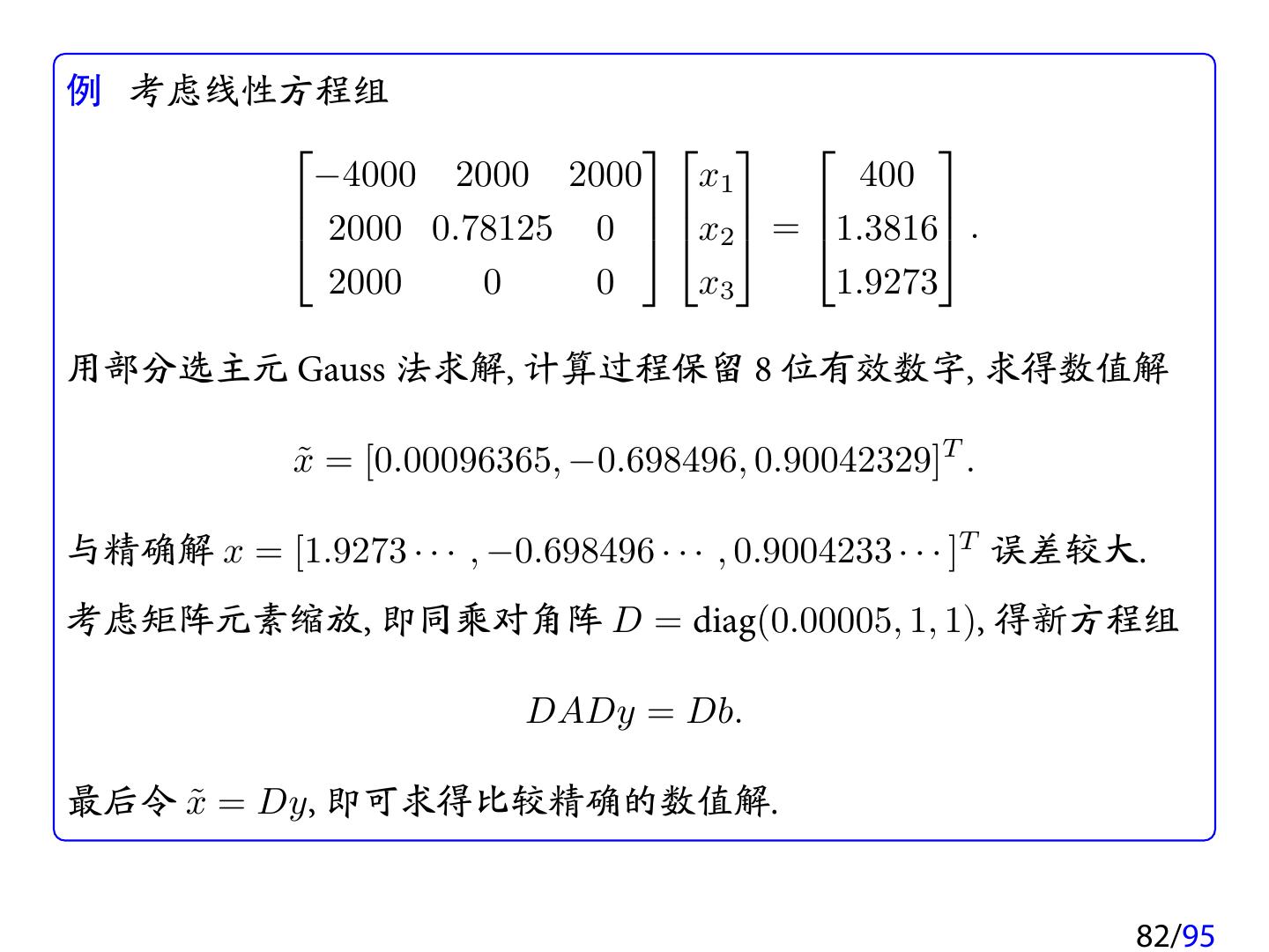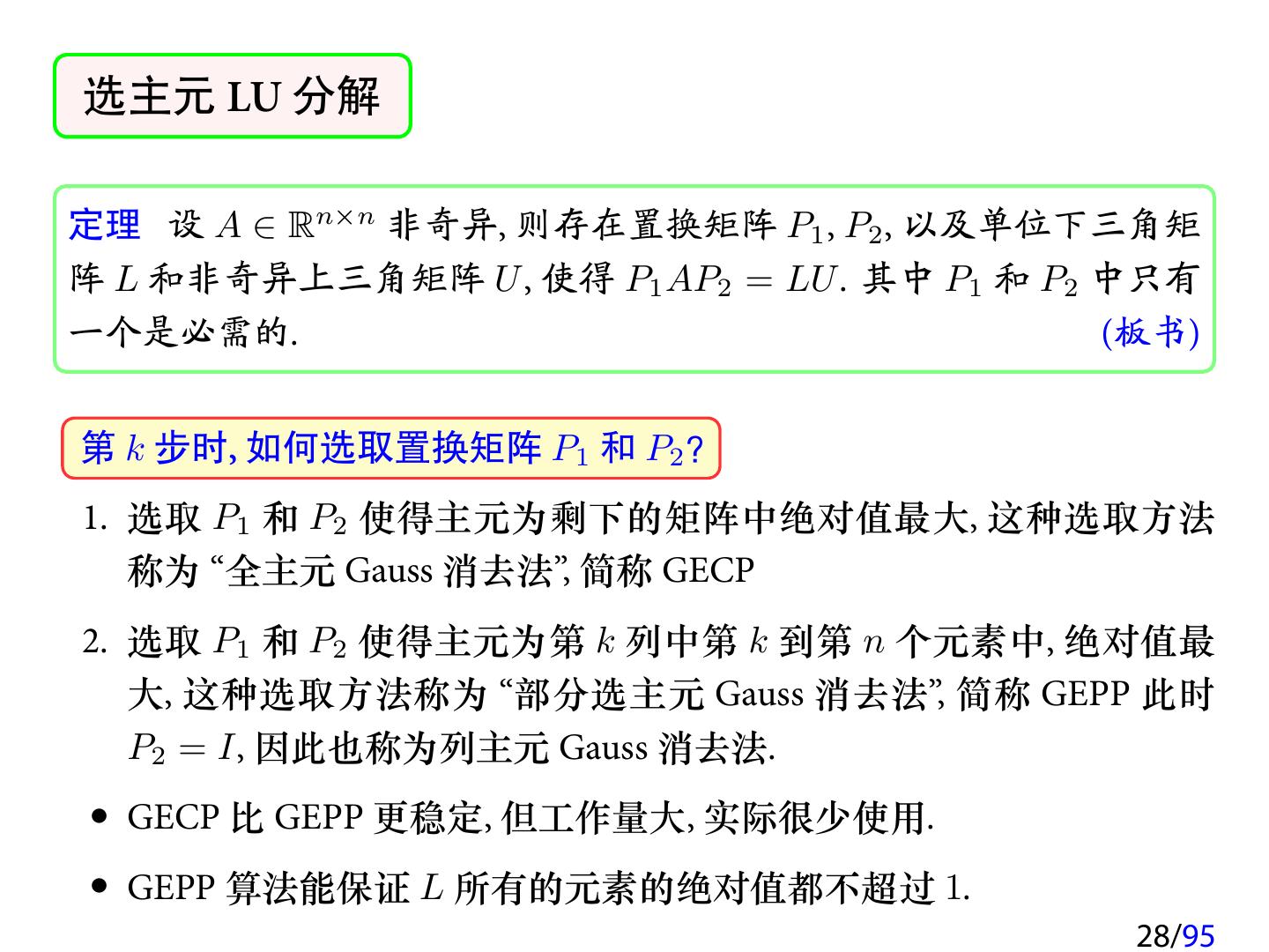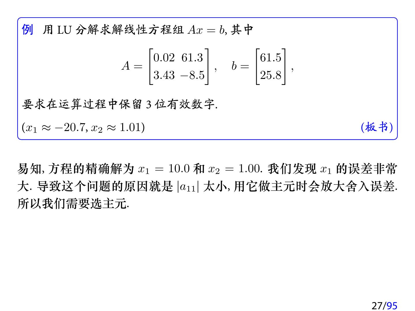 27 .例 用 LU 分解求解线性方程组 Ax = b, 其中 [ ] [ ] 0.02 61.3 61.5 A= , b= , 3.43 −8.5 25.8 要求在运算过程中保留 3 位有效数字. (x1 ≈ −20.7, x2 ≈ 1.01) (板书) 易知, 方程的精确解为 x1 = 10.0 和 x2 = 1.00. 我们发现 x1 的误差非常 大. 导致这个问题的原因就是 |a11 | 太小, 用它做主元时会放大舍入误差. 所以我们需要选主元. 27/95