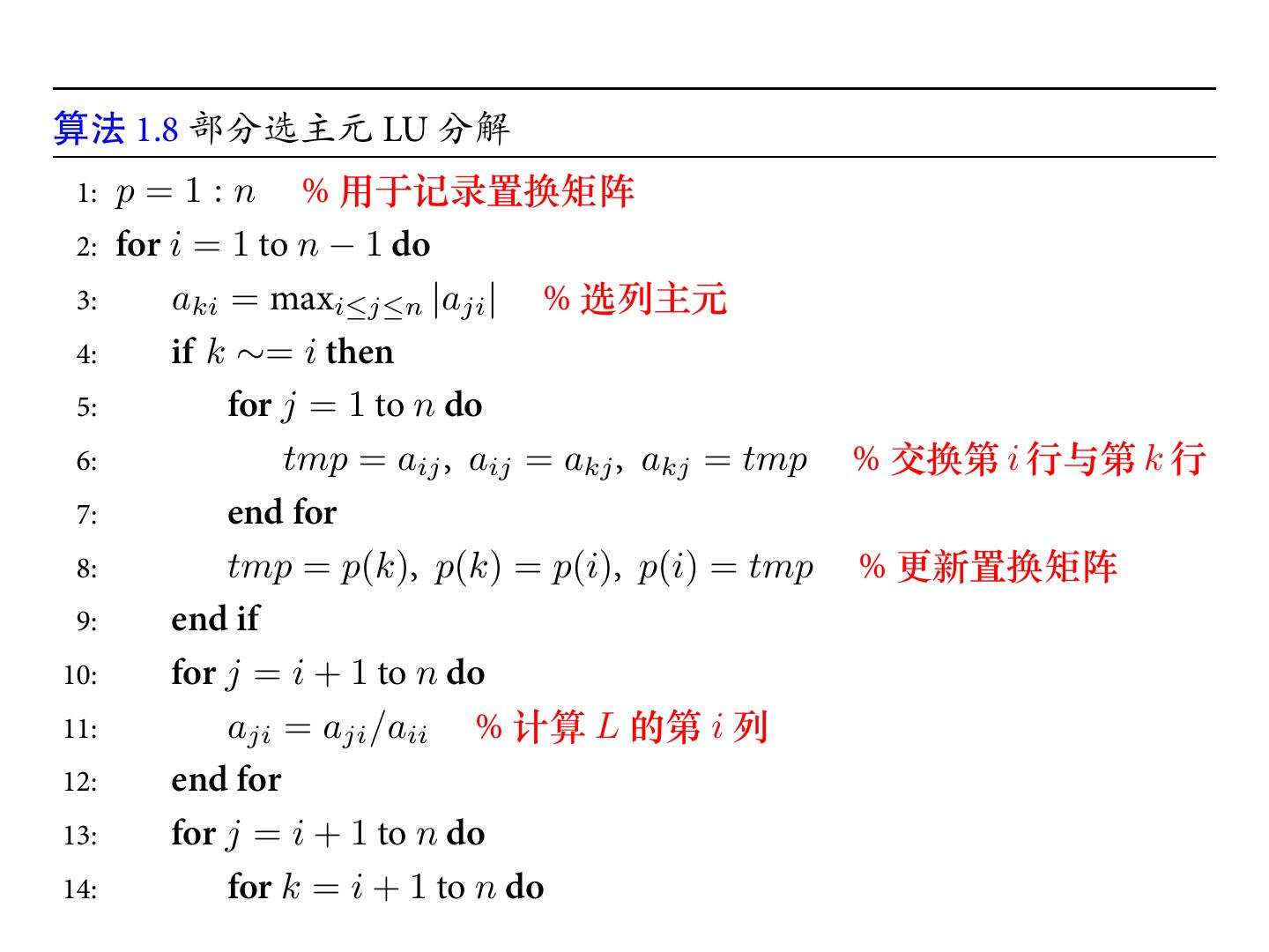 29 .算法 1.8 部分选主元 LU 分解 1: p = 1 : n % 用于记录置换矩阵 2: for i = 1 to n − 1 do 3: aki = maxi≤j≤n |aji | % 选列主元 4: if k ∼= i then 5: for j = 1 to n do 6: tmp = aij , aij = akj , akj = tmp % 交换第 i 行与第 k 行 7: end for 8: tmp = p(k), p(k) = p(i), p(i) = tmp % 更新置换矩阵 9: end if 10: for j = i + 1 to n do 11: aji = aji /aii % 计算 L 的第 i 列 12: end for 13: for j = i + 1 to n do 14: for k = i + 1 to n do