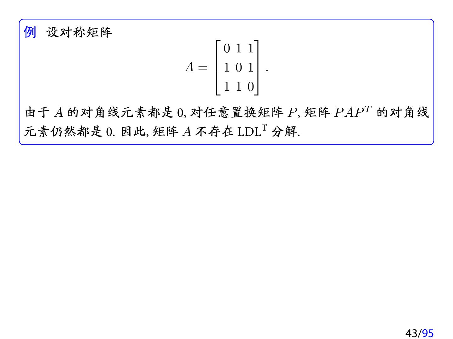 6 .† 需要指出的是: A 非奇异, 则解存在唯一, 但并不一定存在 LU 分解! 定理 (LU 分解的存在性和唯一性) 设 A ∈ Rn×n . 则存在唯一的单位下 三角矩阵 L 和非奇异上三角矩阵 U , 使得 A = LU 的充要条件是 A 的 所有顺序主子矩阵 Ak = A(1 : k, 1 : k) 都非奇异, k = 1, 2, . . . , n. (板书) 6/95