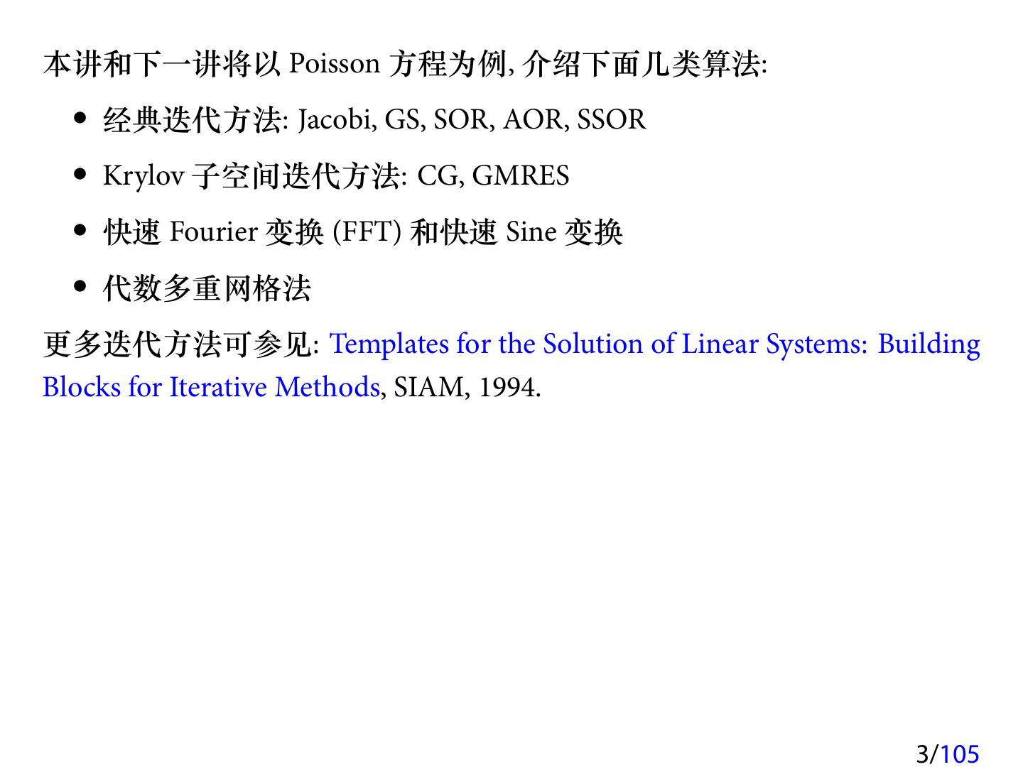 3 .本讲和下一讲将以 Poisson 方程为例, 介绍下面几类算法: • 经典迭代方法: Jacobi, GS, SOR, AOR, SSOR • Krylov 子空间迭代方法: CG, GMRES • 快速 Fourier 变换 (FFT) 和快速 Sine 变换 • 代数多重网格法 更多迭代方法可参见: Templates for the Solution of Linear Systems: Building Blocks for Iterative Methods, SIAM, 1994. 3/105