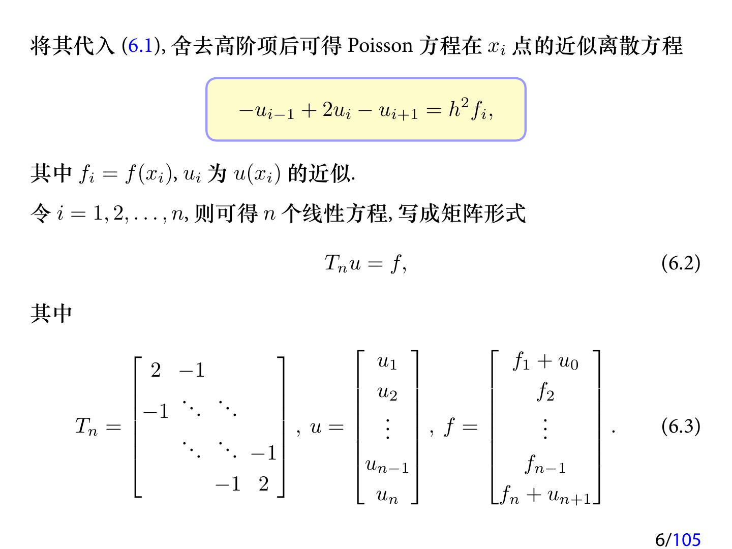 6 .将其代入 (6.1), 舍去高阶项后可得 Poisson 方程在 xi 点的近似离散方程 −ui−1 + 2ui − ui+1 = h2 fi , 其中 fi = f (xi ), ui 为 u(xi ) 的近似. 令 i = 1, 2, . . . , n, 则可得 n 个线性方程, 写成矩阵形式 Tn u = f, (6.2) 其中 2 −1 u1 f1 + u0 u −1 . . . .. 2 f2 . . . Tn = , u = .. , f = .. . (6.3) .. .. . . −1 un−1 fn−1 −1 2 un fn + un+1 6/105