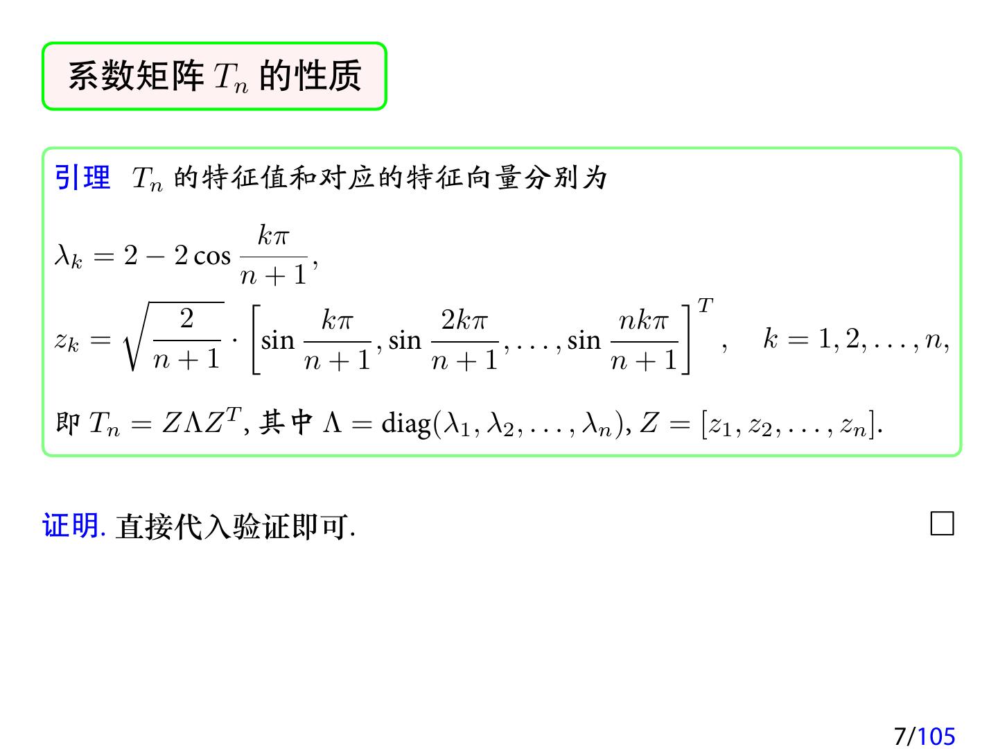 7 . 系数矩阵 Tn 的性质 引理 Tn 的特征值和对应的特征向量分别为 kπ λk = 2 − 2 cos , n+1 √ [ ]T 2 kπ 2kπ nkπ zk = · sin , sin , . . . , sin , k = 1, 2, . . . , n, n+1 n+1 n+1 n+1 即 Tn = ZΛZ T , 其中 Λ = diag(λ1 , λ2 , . . . , λn ), Z = [z1 , z2 , . . . , zn ]. 证明. 直接代入验证即可. □ 7/105