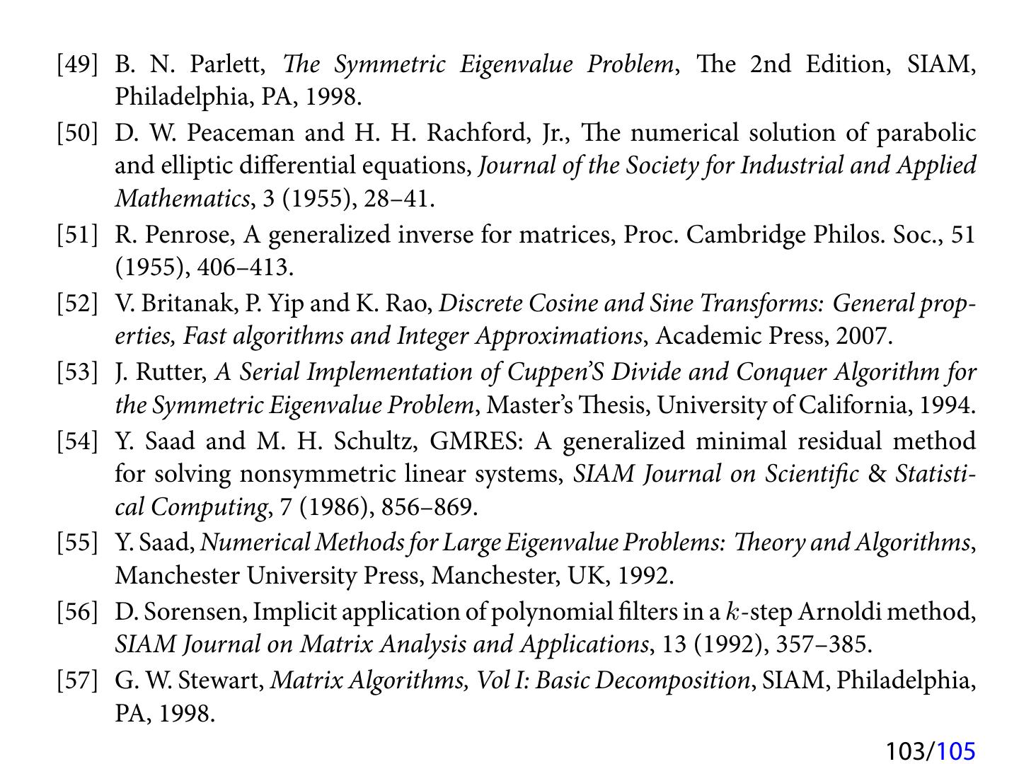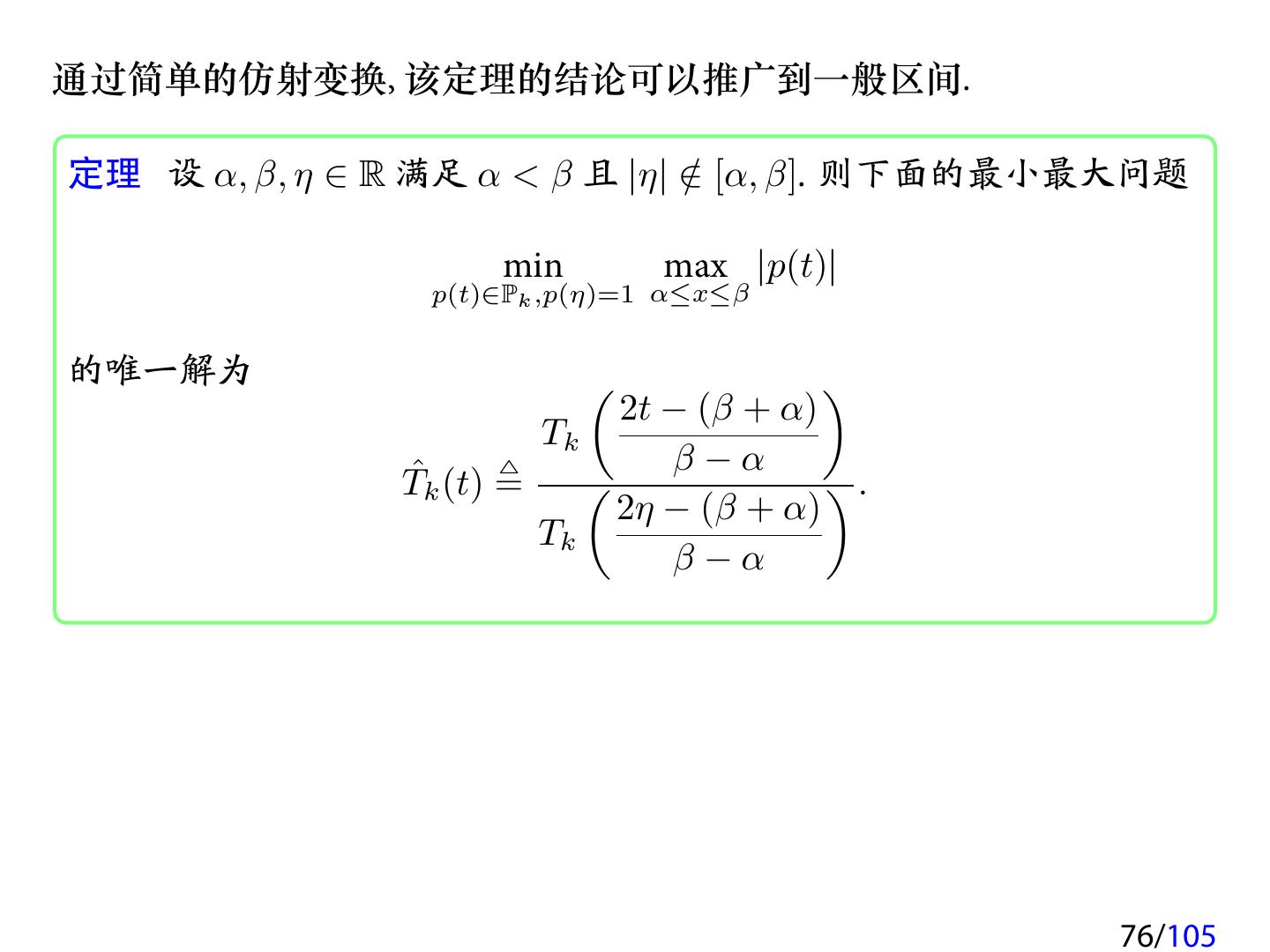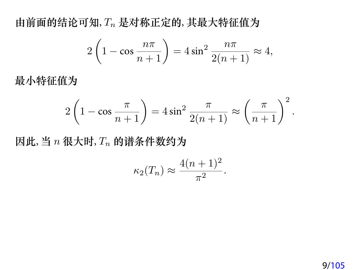9 .由前面的结论可知, Tn 是对称正定的, 其最大特征值为 ( ) nπ nπ 2 1 − cos = 4 sin2 ≈ 4, n+1 2(n + 1) 最小特征值为 ( ) ( )2 π π π 2 1 − cos 2 = 4 sin ≈ . n+1 2(n + 1) n+1 因此, 当 n 很大时, Tn 的谱条件数约为 4(n + 1)2 κ2 (Tn ) ≈ . π2 9/105