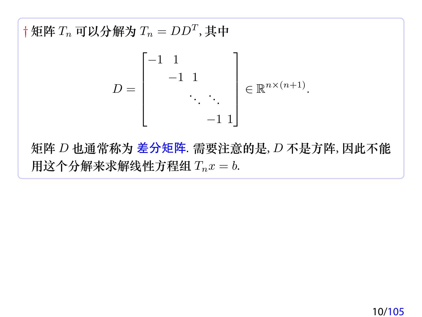 10 .† 矩阵 Tn 可以分解为 Tn = DDT , 其中 −1 1 −1 1 D= .. .. ∈ R n×(n+1) . . . −1 1 矩阵 D 也通常称为 差分矩阵. 需要注意的是, D 不是方阵, 因此不能 用这个分解来求解线性方程组 Tn x = b. 10/105